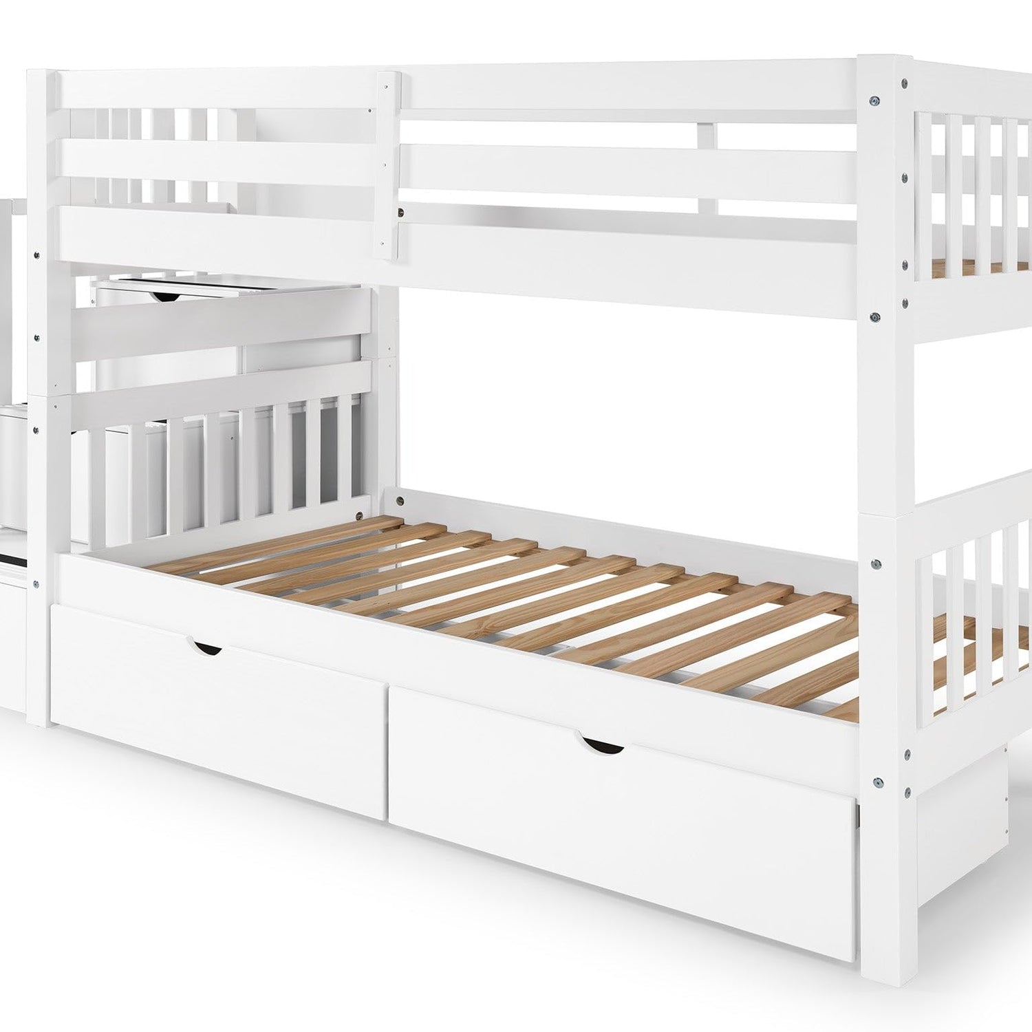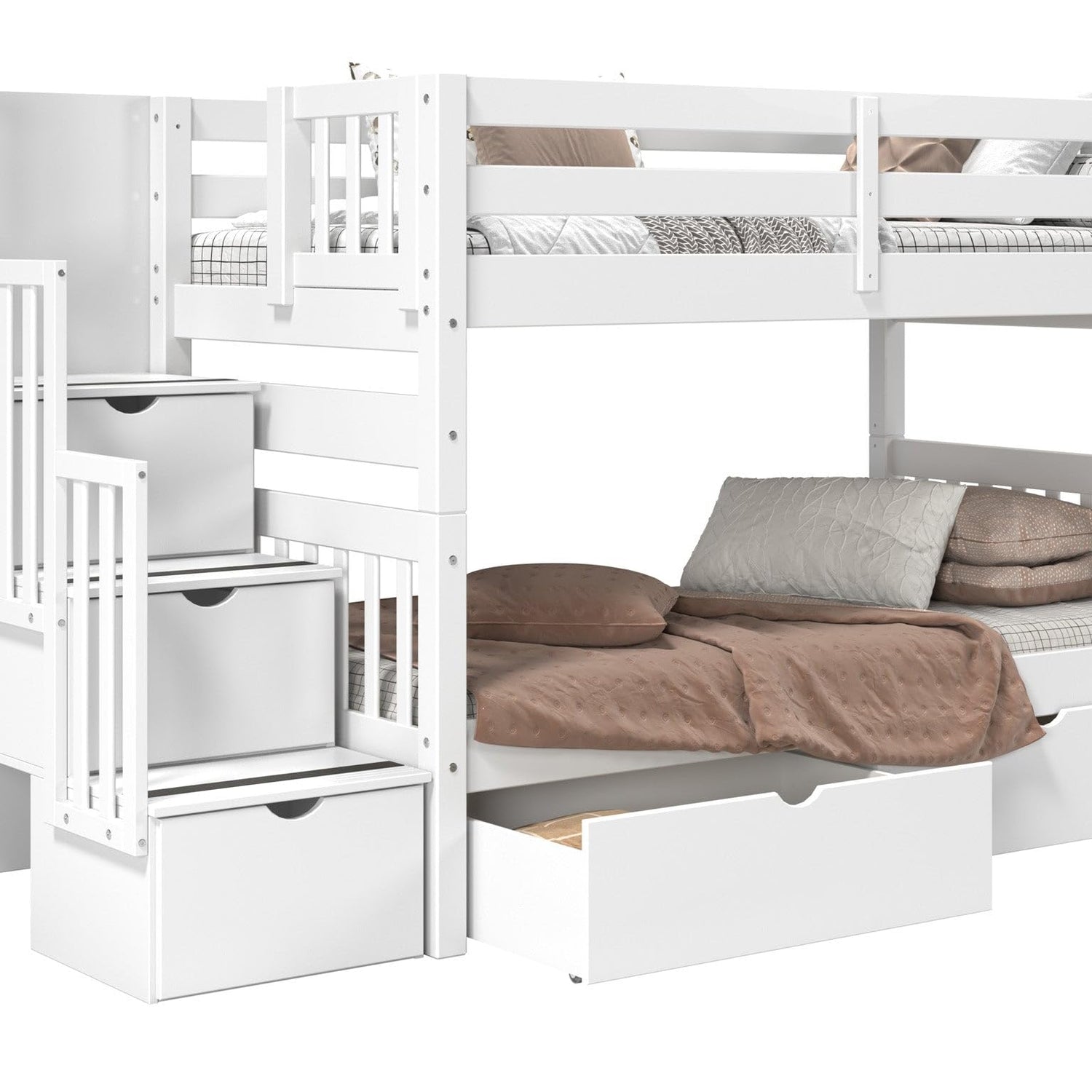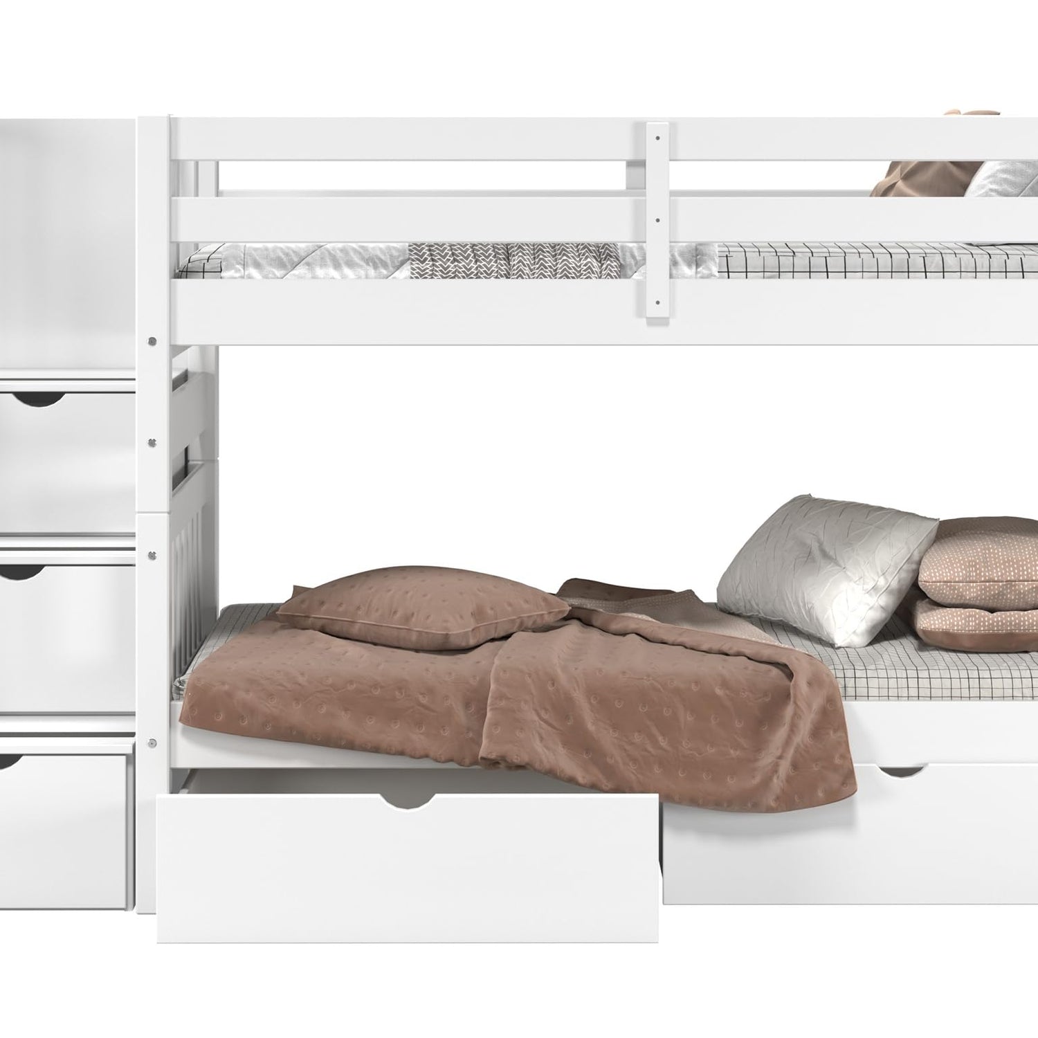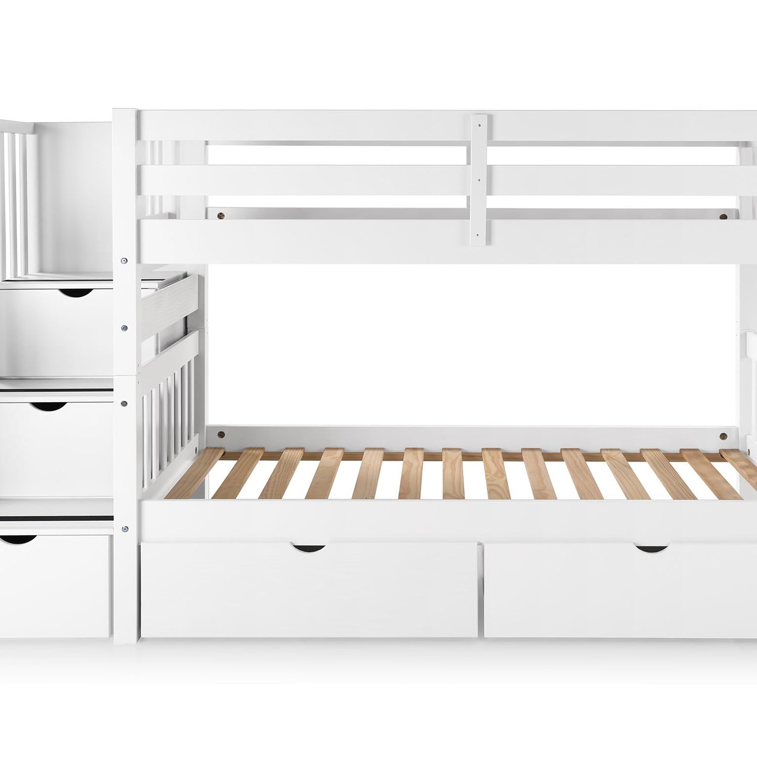 Bedz King Stairway Bunk Beds Twin over Twin with 3 Drawers in the Steps and 2 Under Bed Drawers, White