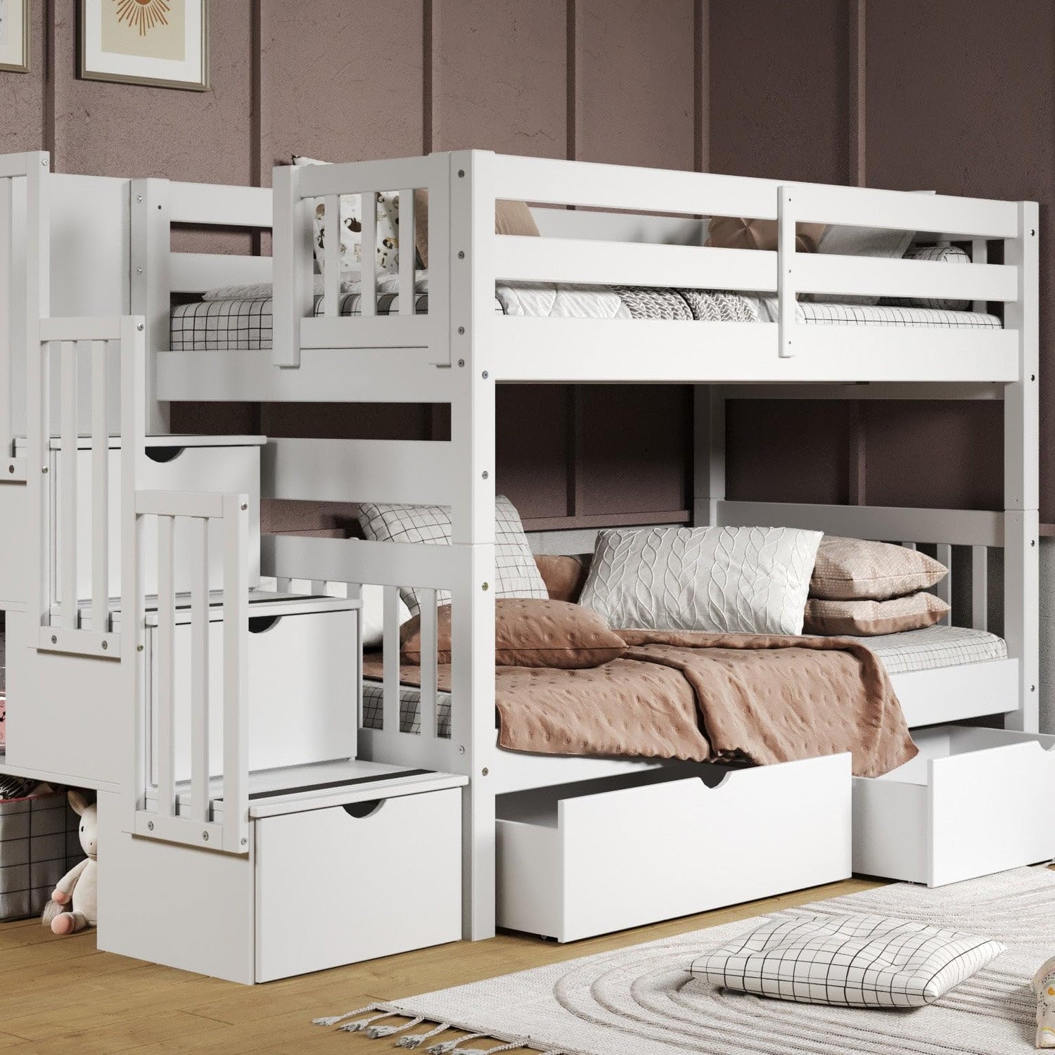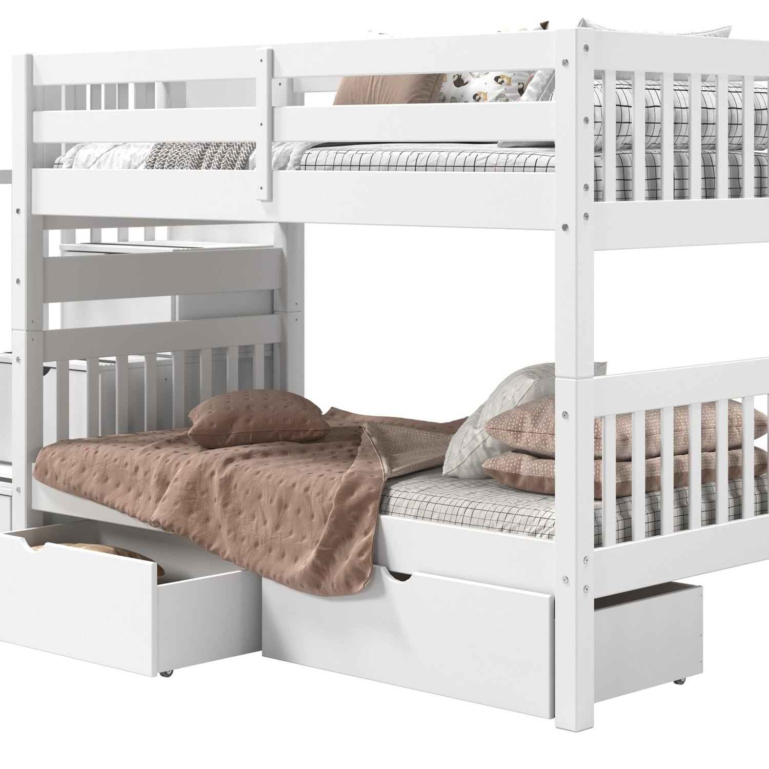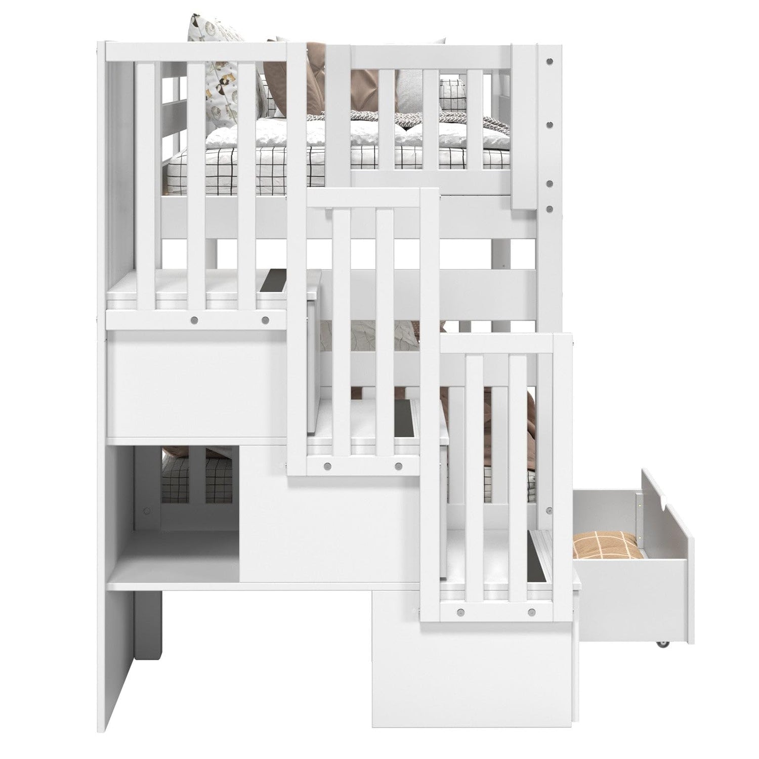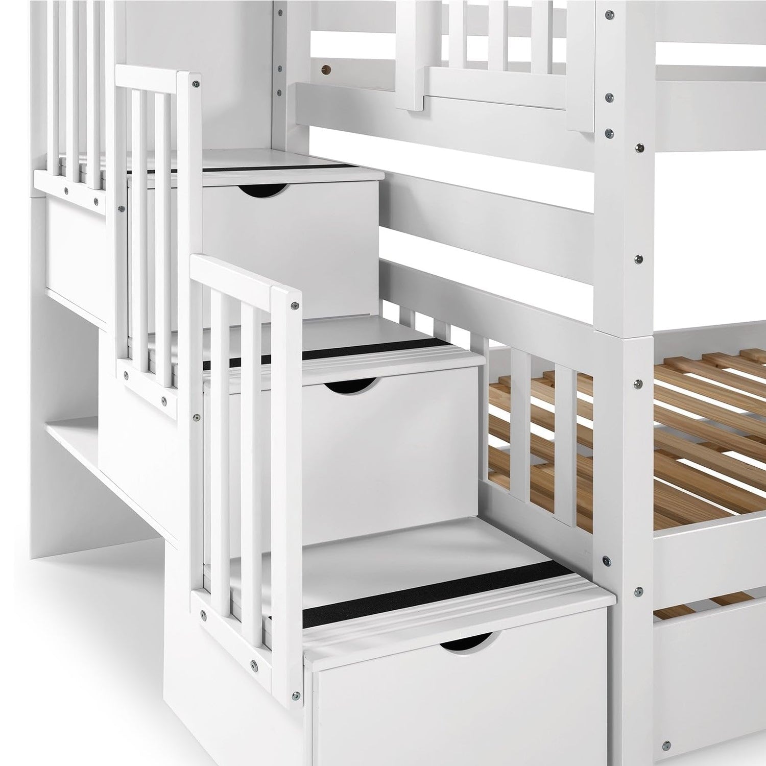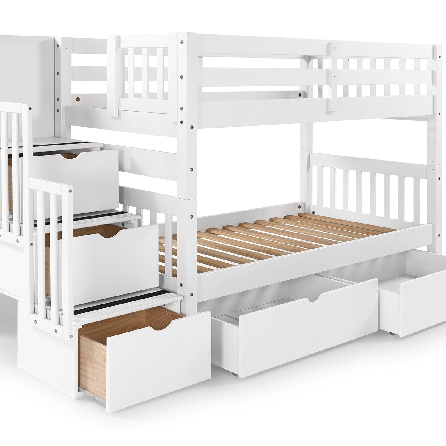 Bedz King Stairway Bunk Beds Twin over Twin with 3 Drawers in the Steps and 2 Under Bed Drawers, White