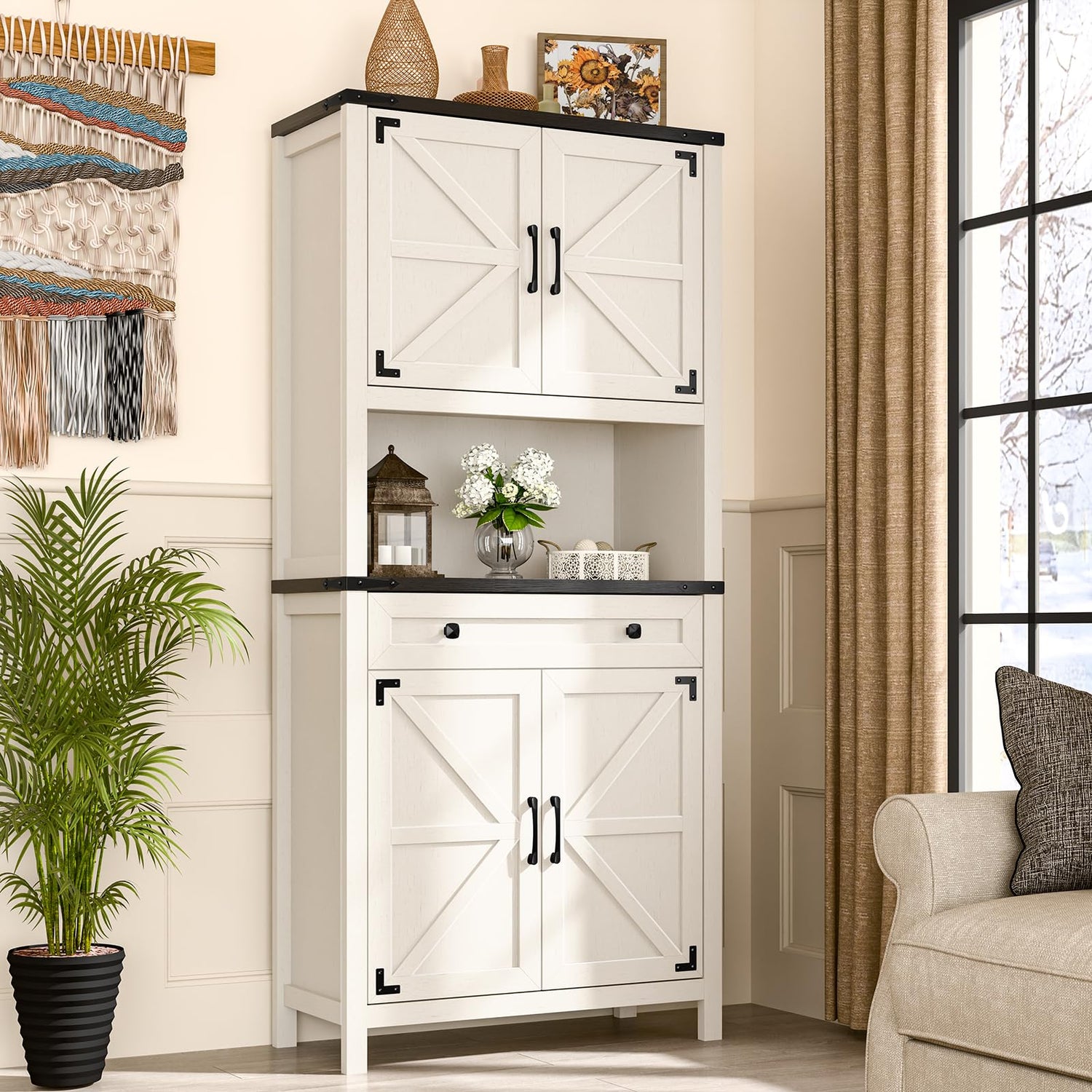 - Generous Storage Capacity: Struggling with limited cabinet space? This farmhouse storage cabinet provides an ideal solution with its spacious 31" W x 13" D x 69" H dimensions. Designed for maximum efficiency, it includes 4 barn doors, 1 large drawer, an open shelf, and 2 adjustable shelves to keep your belongings organized and within easy reach.