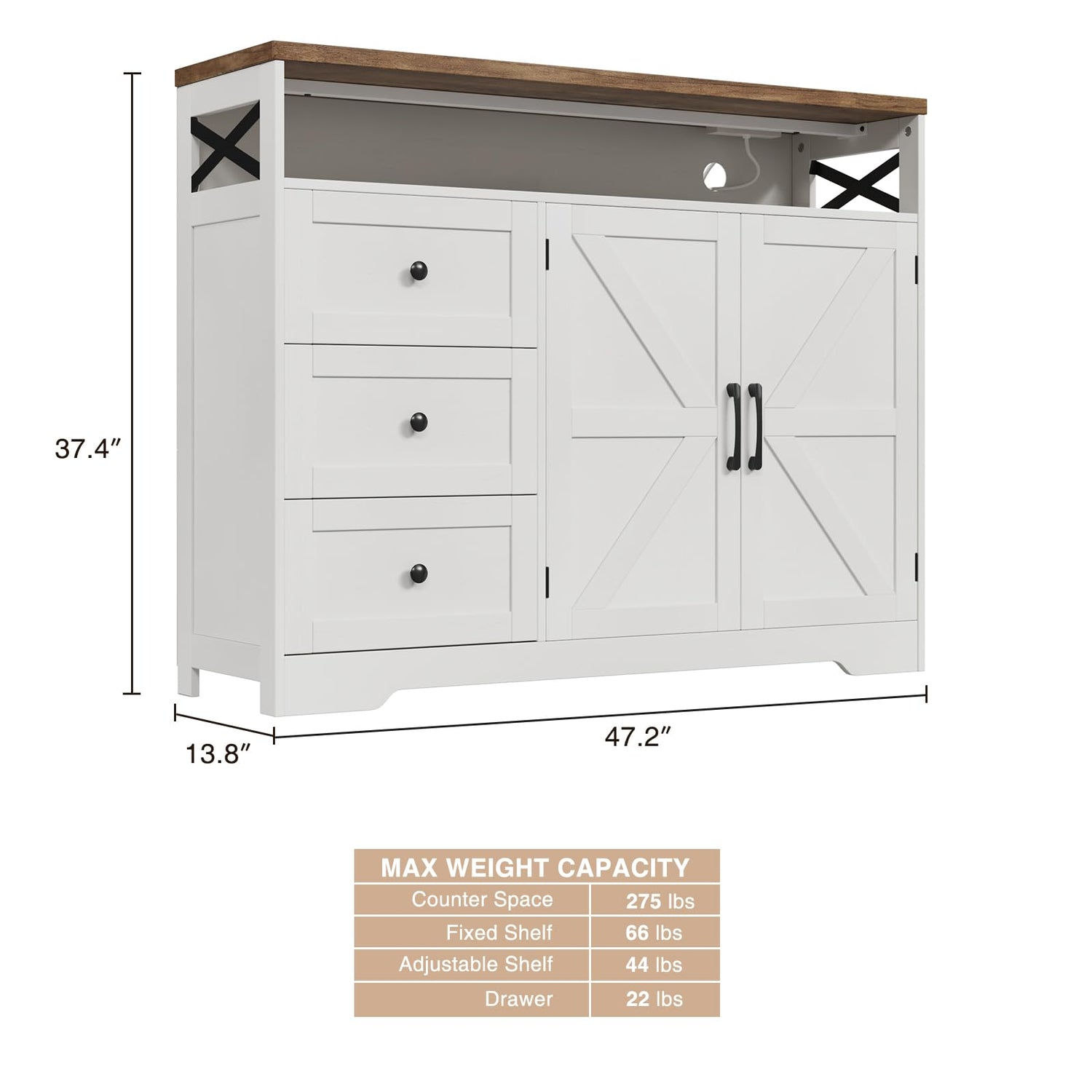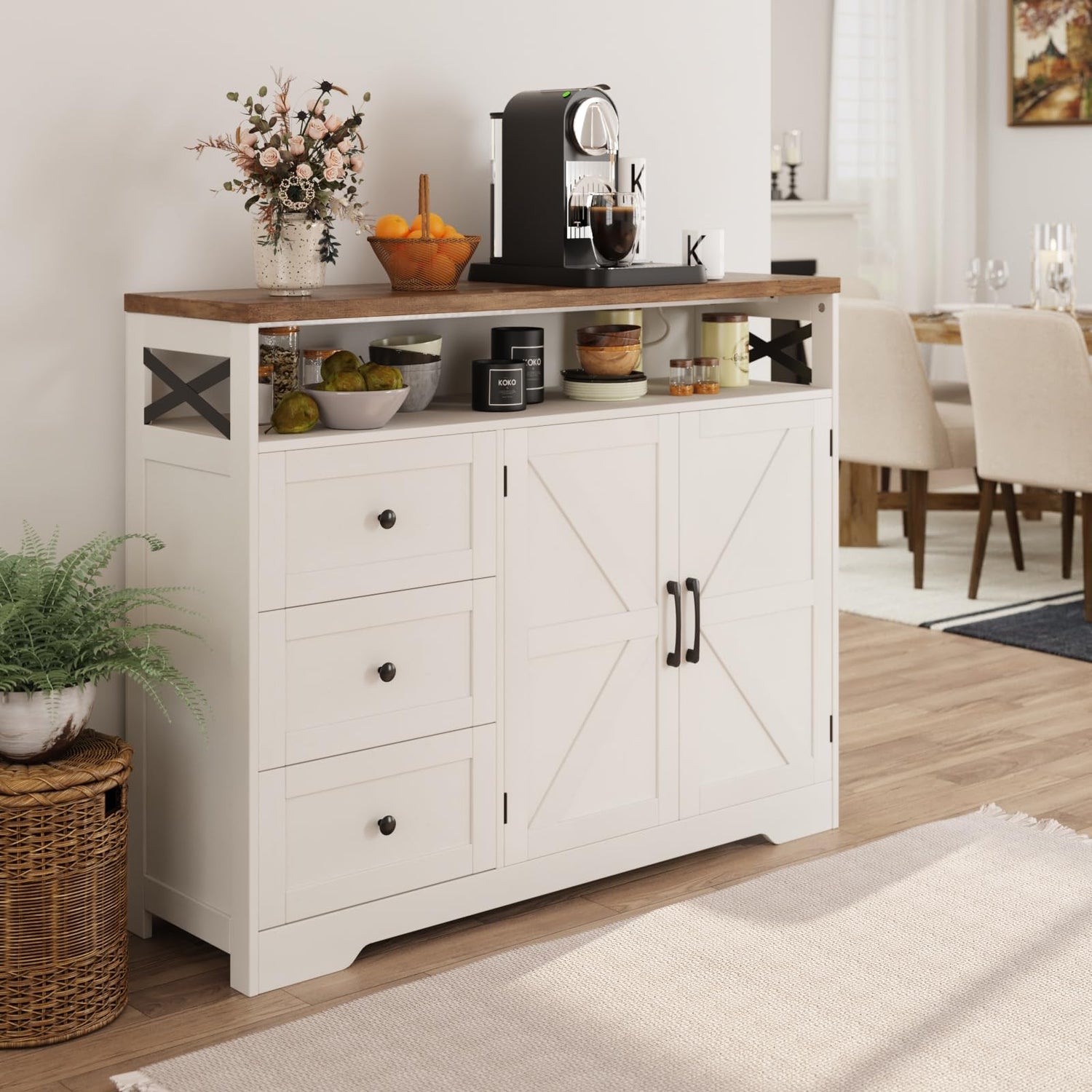 - FUNCTIONAL STORAGE CHEST: Designed with 2 doors, 3 drawers, 1 open shelf and 1 adjustable shelf, this farmhouse buffet storage cabinet easily integrates into your home environment, providing you with ample storage space and neat organization.
