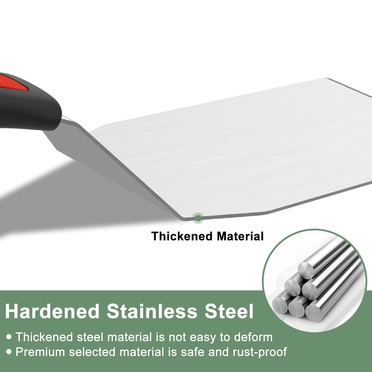 - Hardened Stainless Steel: This commercial grade spatula stainless steel is hardened, sturdy steel blade eliminates flex for smash burgers and tough scraping tasks