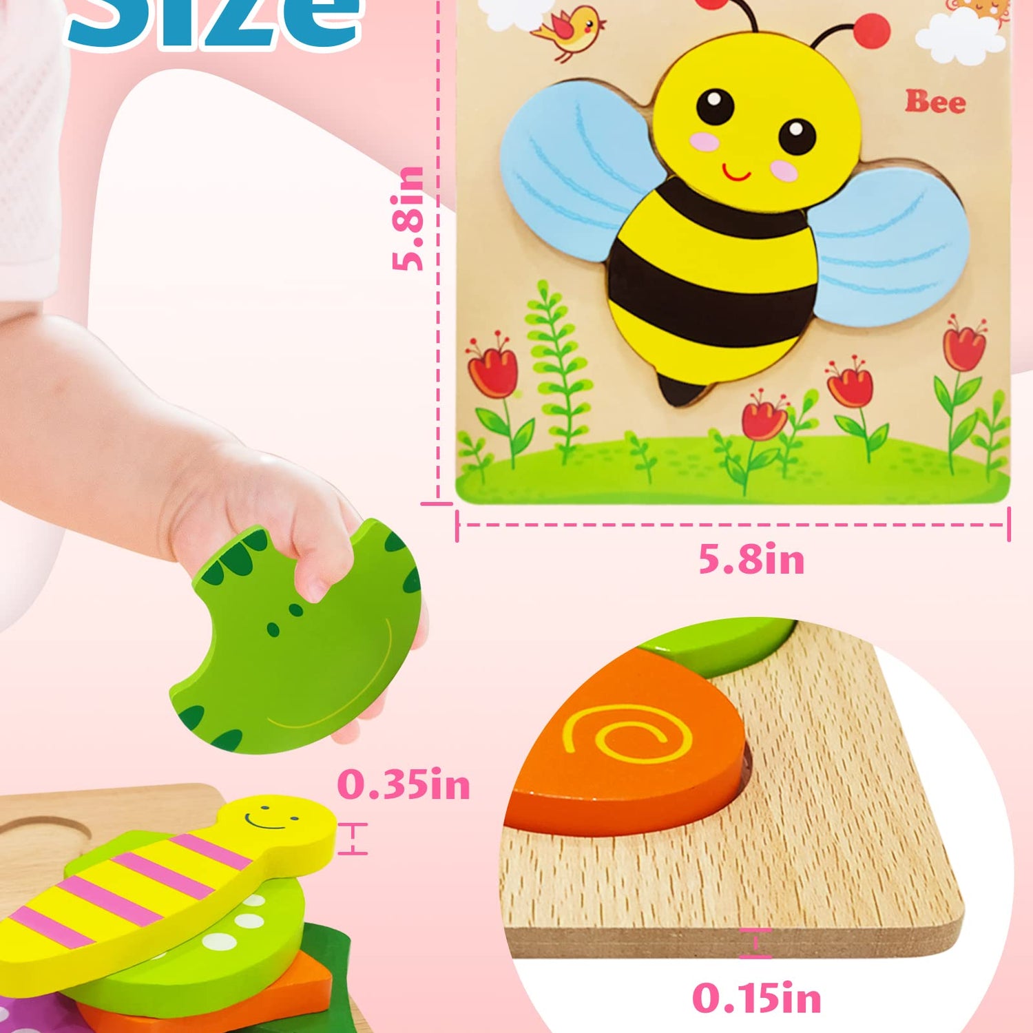 - Perfect Toddlers Toys: Each animal wooden puzzle is 5.8 x 5.8 x 0.4 in.Toddler puzzles pieces thick enough for your kids to pick up and place easily which will fit nicely into little hands; The toddler puzzles are too big for toddlers’ mouth, so don't worry that toddlers will swallow the pieces