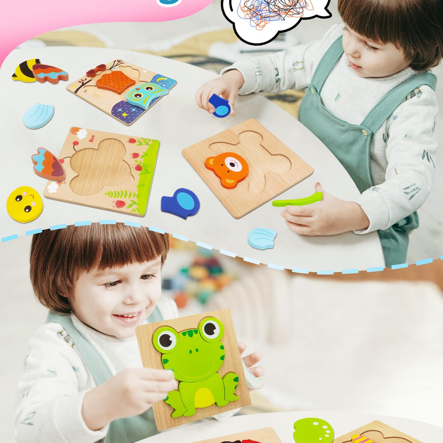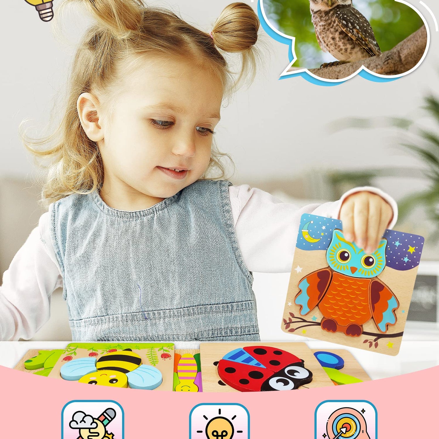 - Learning Educational Through Playing: Wooden toddler puzzles contain 6 pack well-selected animal jigsaw: bear, ladybug, butterfly, owl, bee and frog,which help boys and girls aged 1 2 3 to develop toddler's patience, imagination, concentration, colors & shapes recognition and hand-eye coordination while playing