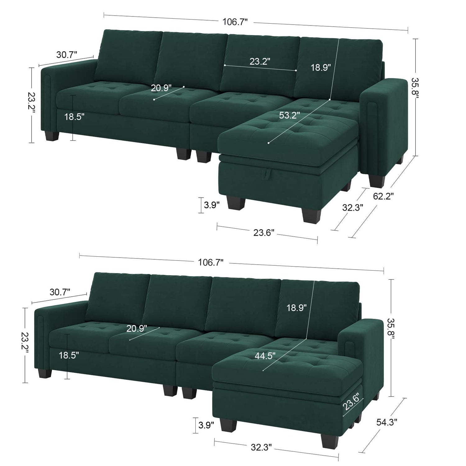 - SUITABLE DIMENSIONS: Overall dimensions of L shaped sectional couch is 106.7"(W) x 62.2"(D) x 35.8"(H). Dimensions of single storage ottoman is 23.6"(W) x 32.3"(D) x18.5"(H) . Space saving and durable.Belffin has an excellent after-sale service team, please feel free to contact us if you have any questions. We are glad to serve you.