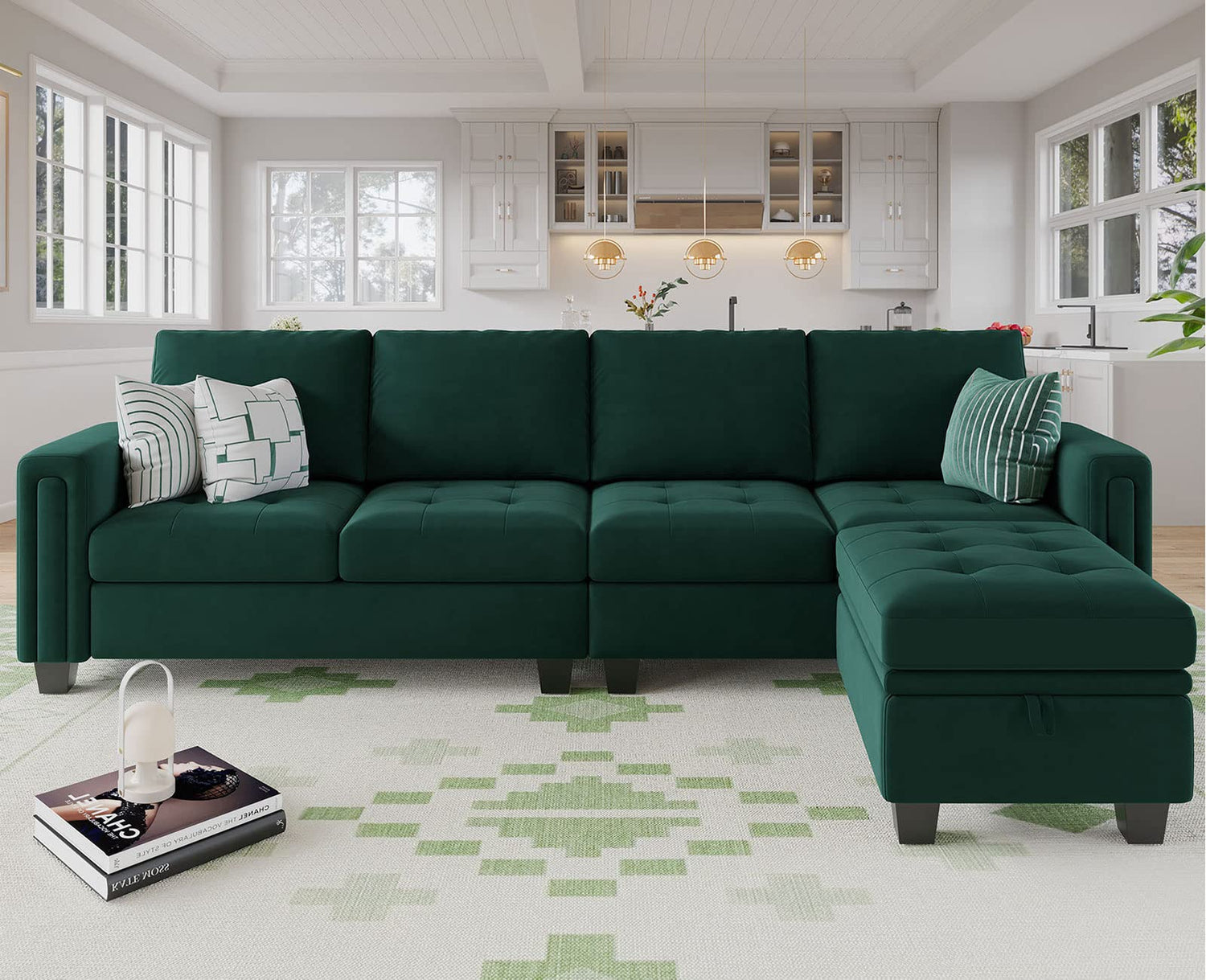 Belffin Velvet Reversible Sectional Sofa with Chaise Convertible L Shaped 4-seat Sectional Couch with Storage Ottoman Green
