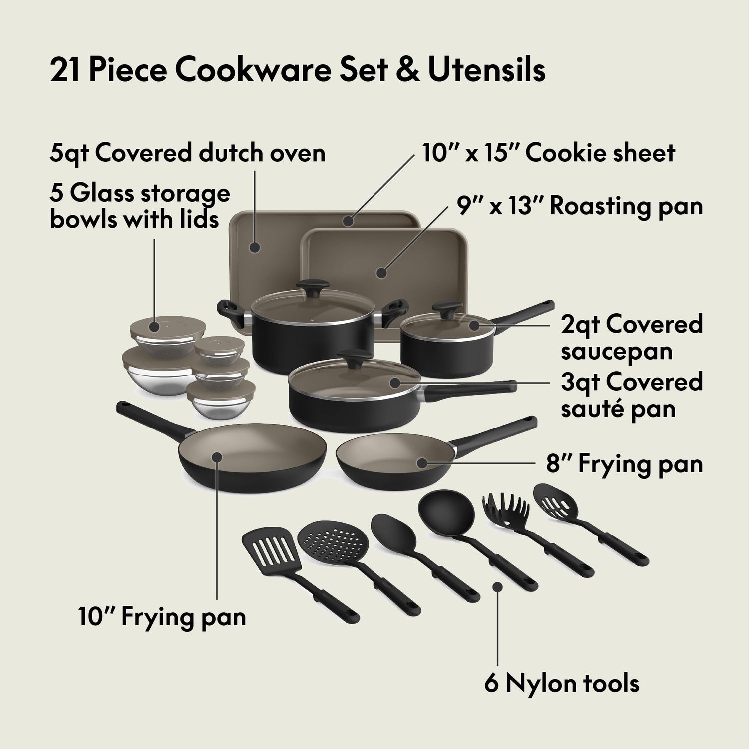 bella 21 Piece Kitchen Set with EverGood™ Ceramic Nonstick Coating, Dishwasher & Oven Safe, All Stovetops Compatible, Tempered Glass Lids & Cool Touch Handles, Black