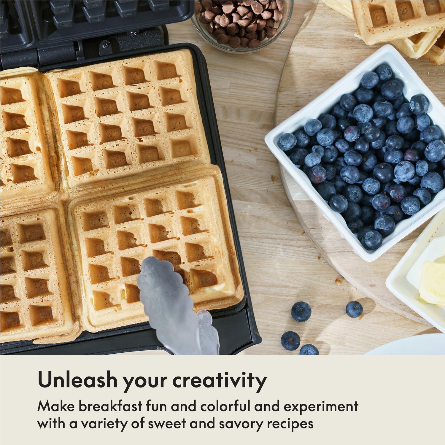 - MAKE BREAKFAST FOR THE WHOLE FAMILY - Our Belgian waffle iron is exactly what you need for busy mornings when time is of the essence; thanks to the extra large double plates you can quickly make 4 fluffy and thick waffles (1.2") in under 6 minutes!