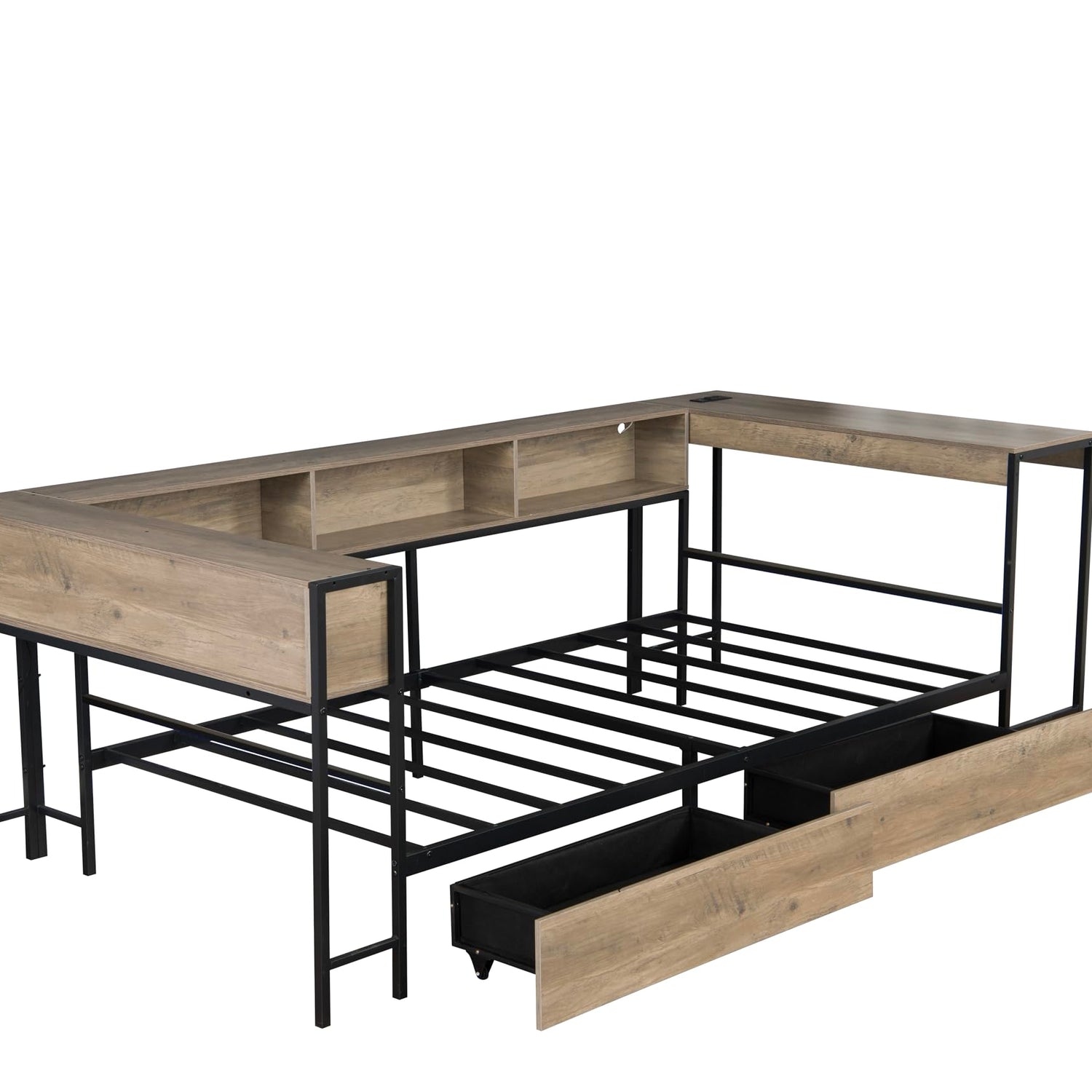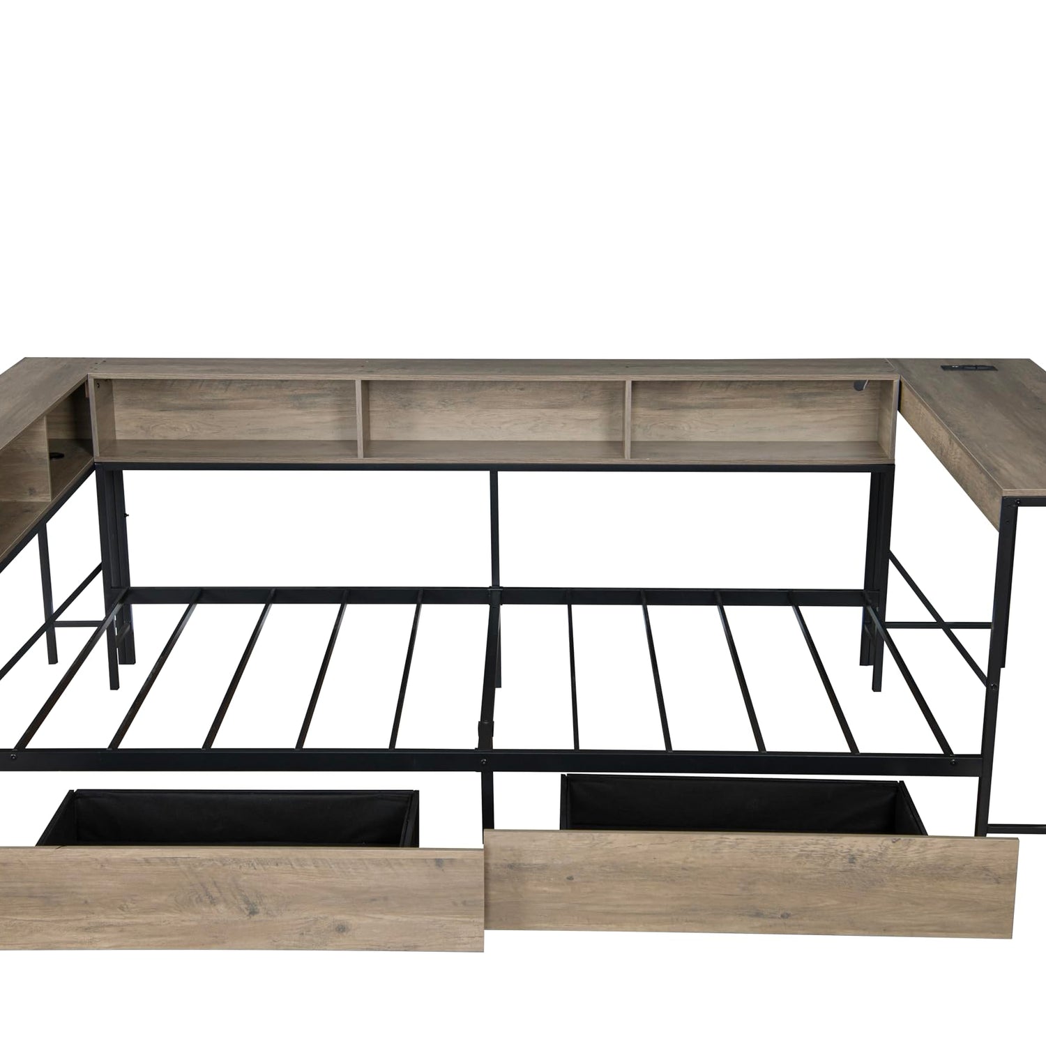 Bellemave Full Corner Bed Frame with Desk and Storage, Full Size Captains Bed with Charging Station and LED Light, Wood Daybeds with L-Shaped Bookcase and 2 Drawers, Grey