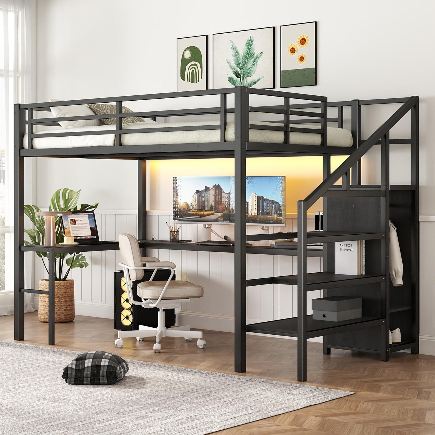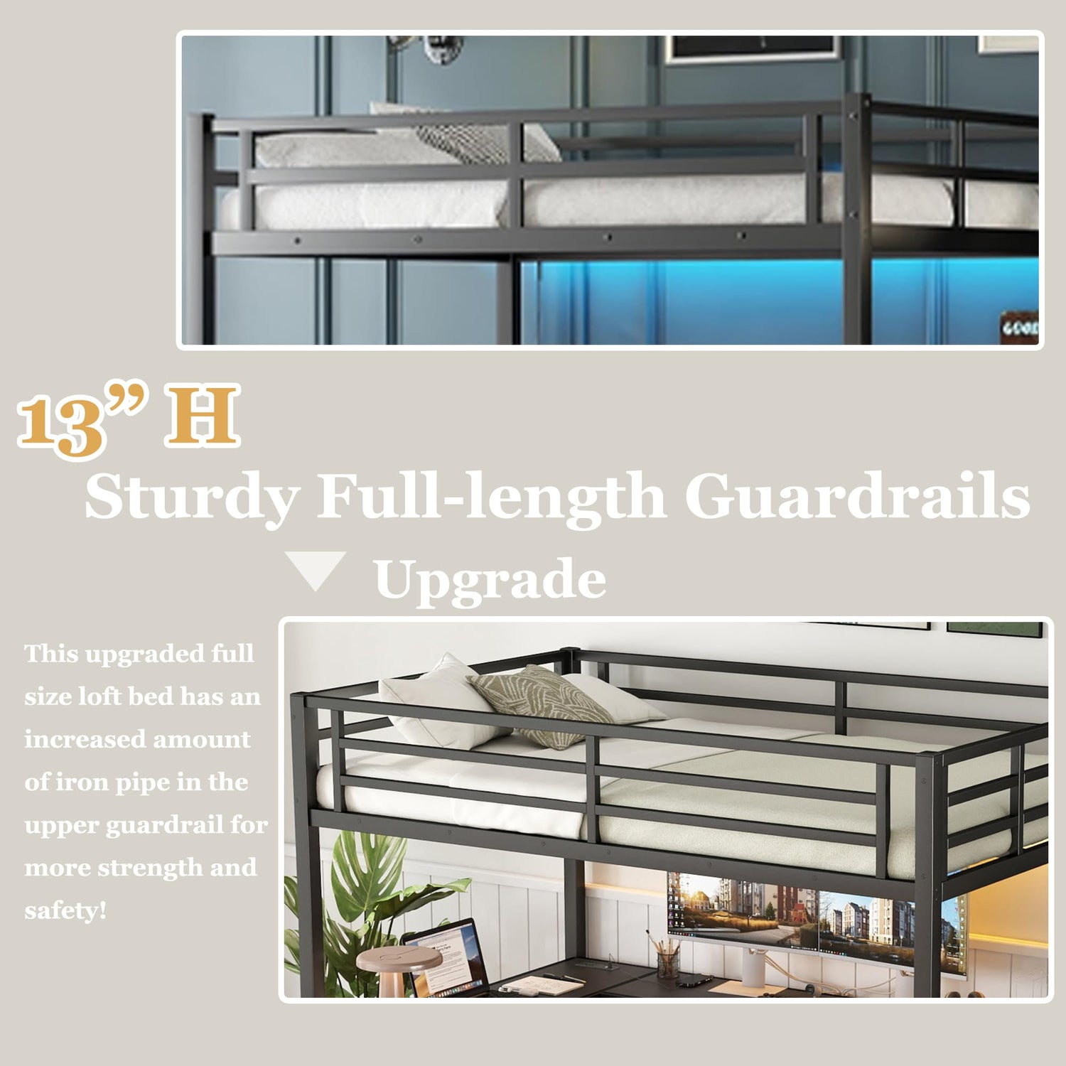 - 🏆【Heavy-Duty Loft Bed Frame】This full loft bed with desk is made of high-quality, heavy-duty metal, so it's strong and stable—no wobbling. The top bunk can hold up to 350 pounds. The full size loft bed frame comes with a sturdy and spacious staircase so kids can safely climb to the top bunk. The upgraded 13" reinforced full-length guardrails keep kids safe while they sleep.