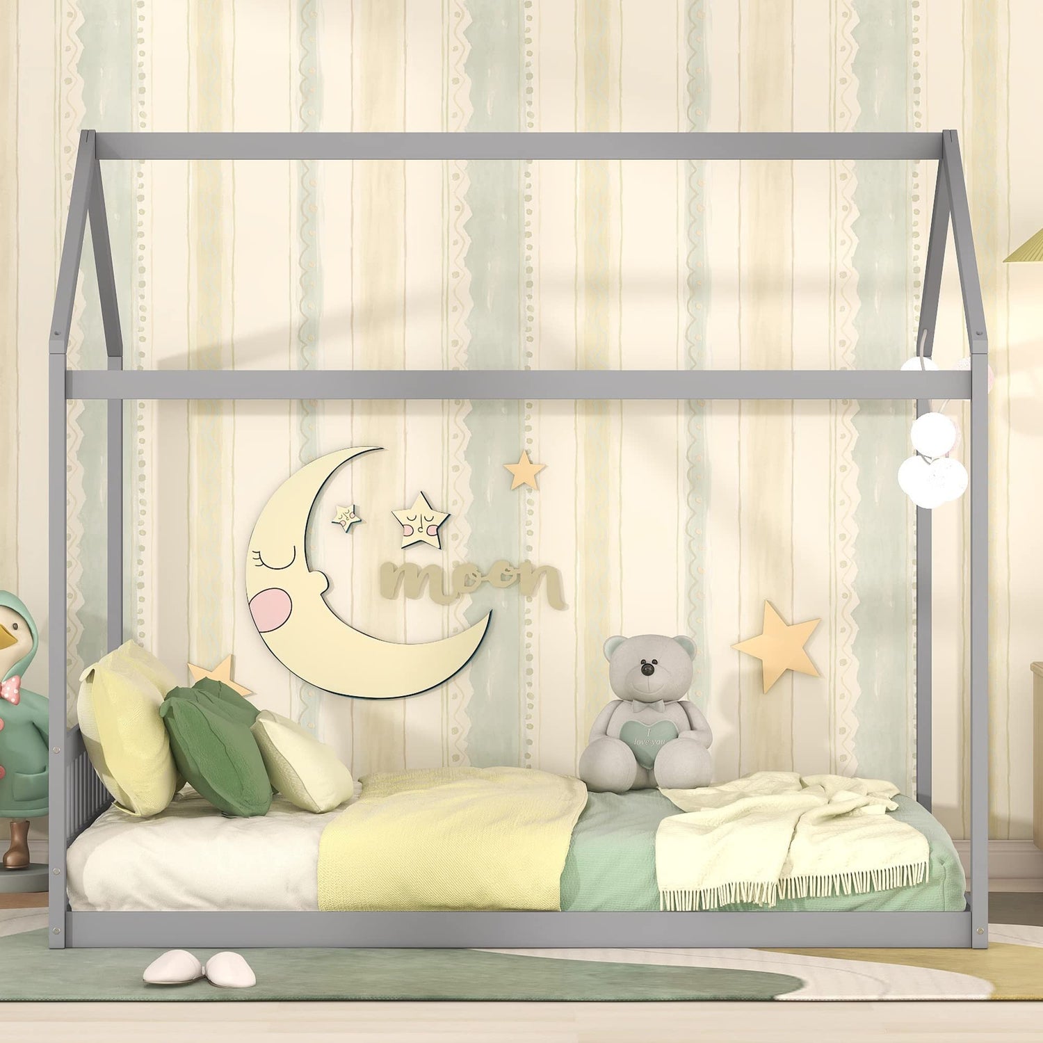 Bellemave Gray Wooden Queen Size Montessori House Bed Frame for Kids