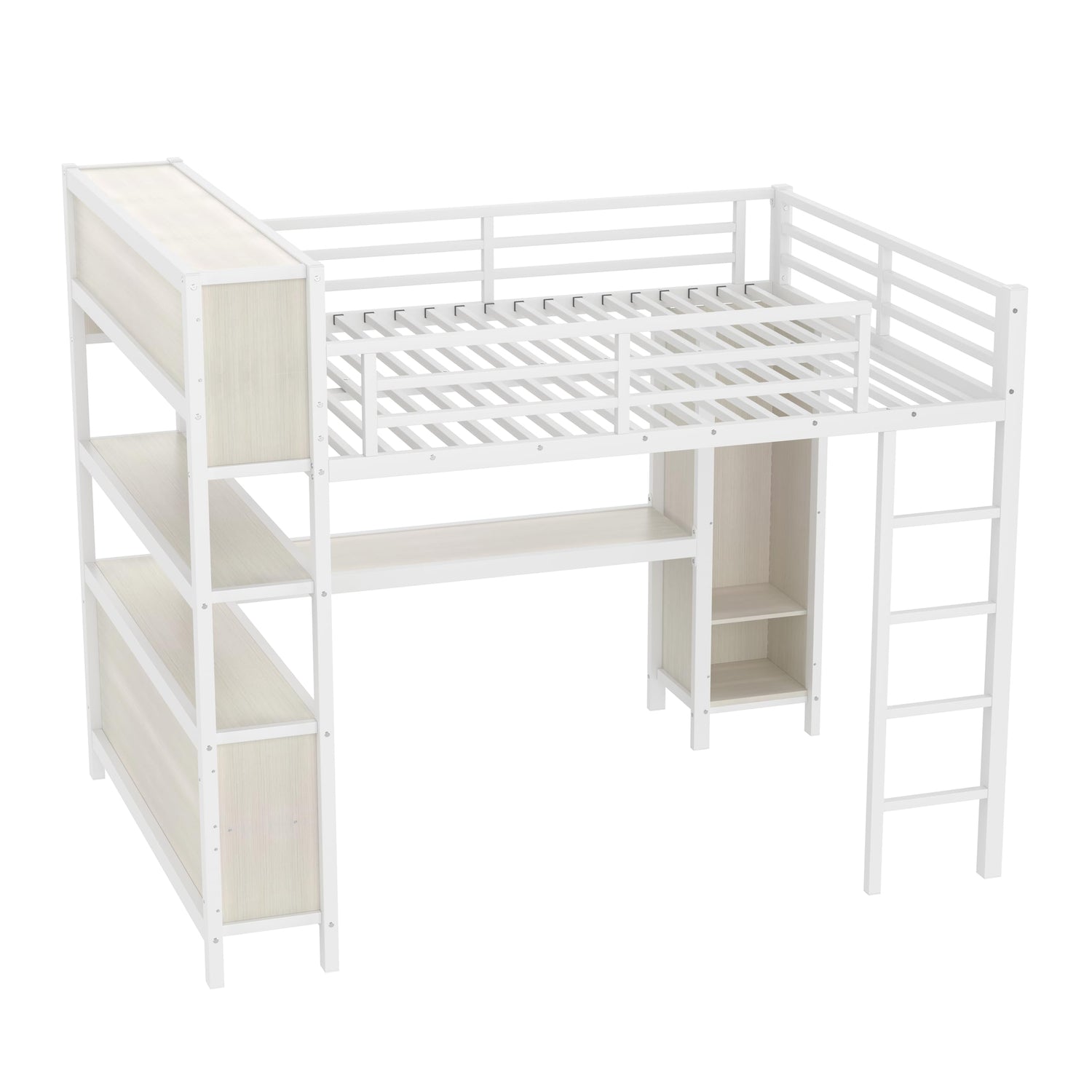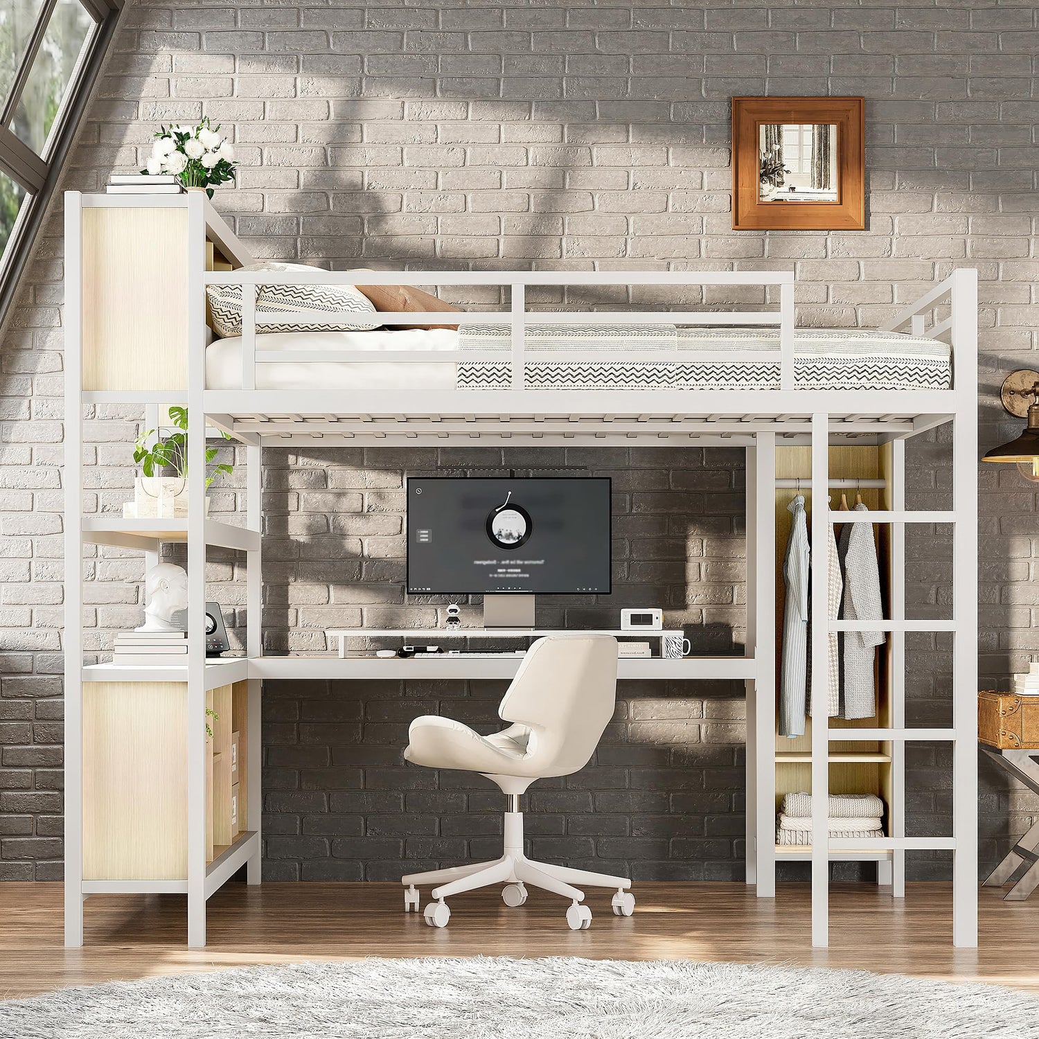Bellemave Queen Loft Bed with Desk & Wardrobe, Heavy Duty Metal Loft Beds with Storage Shelves, Space Saving Loft Bed Queen Size with Safety Guard, White Wood Grain