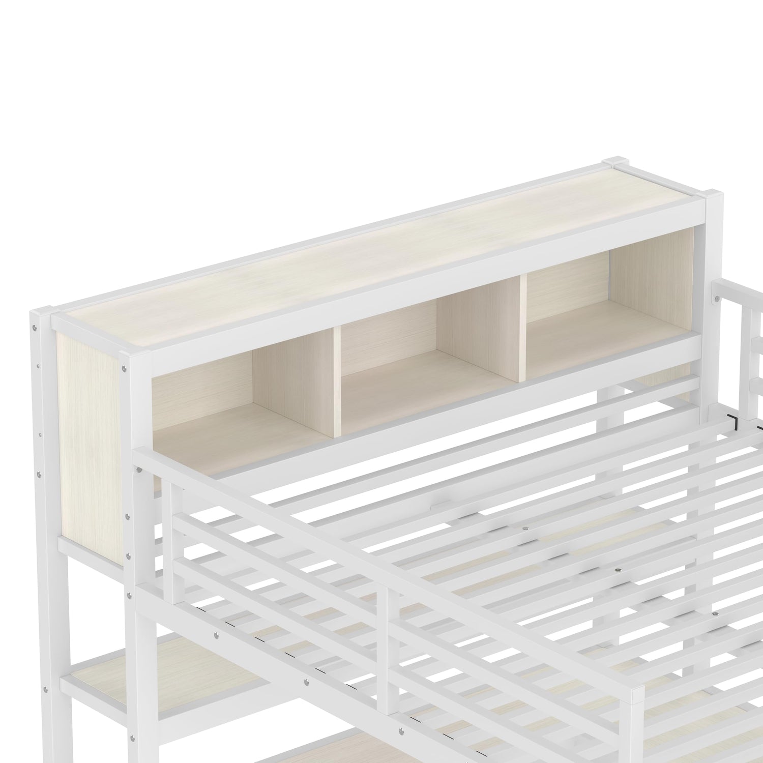 Details: Bellemave Queen Loft Bed with Desk & Wardrobe, Heavy Duty Metal Loft Beds with Storage Shelves, Space Saving Loft Bed Queen Size with Safety Guard, White Wood Grain