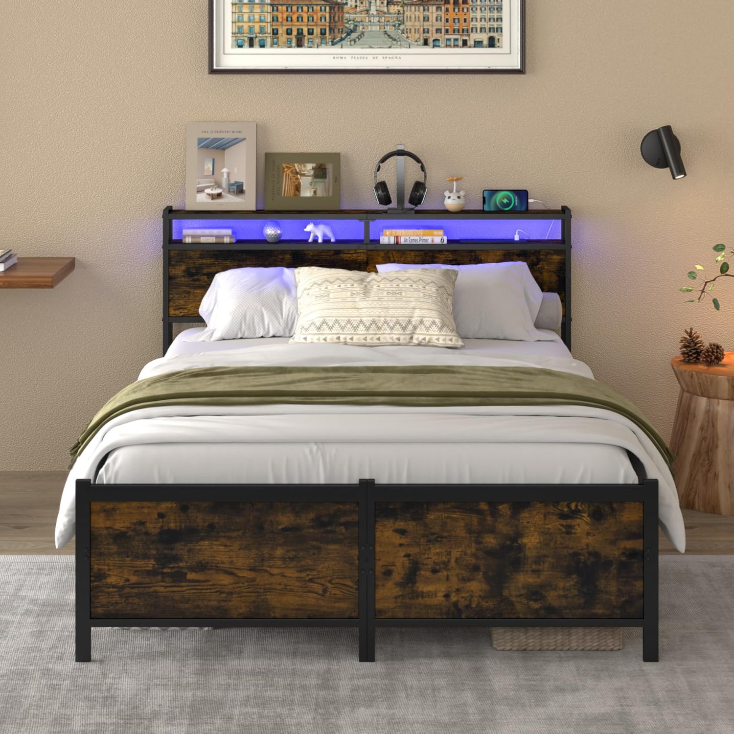 Bellemave Queen Size Bed Frame with Charging, Queen Size Bed Frame with Headboard and Charging Station, Brown Platform Bed Frame with Led Lightstation, No Box Spring Needed, (Queen,Rustic Brown)
