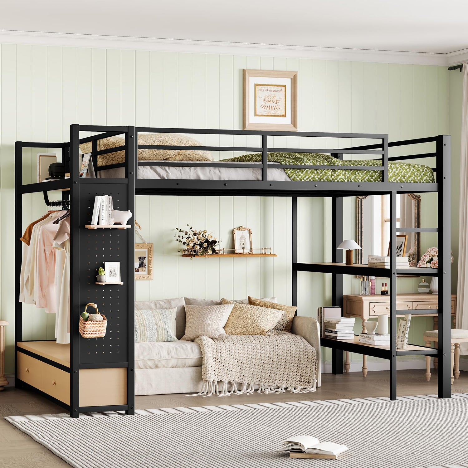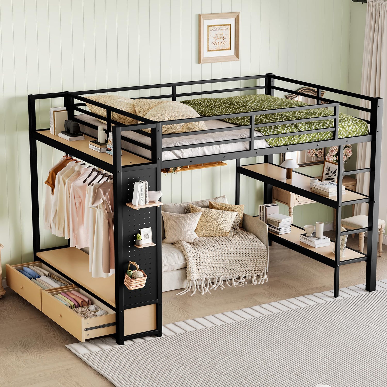 Bellemave Queen Size loft Bed with Wardrobe and Storage Shelves and Pegboard Drawers, Metal Queen Loft Bed Frame for Adults, Kids, Teens, Black
