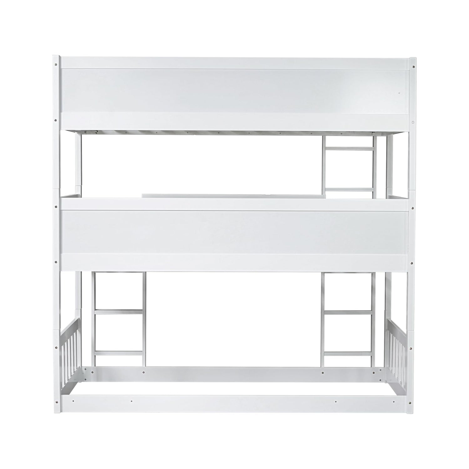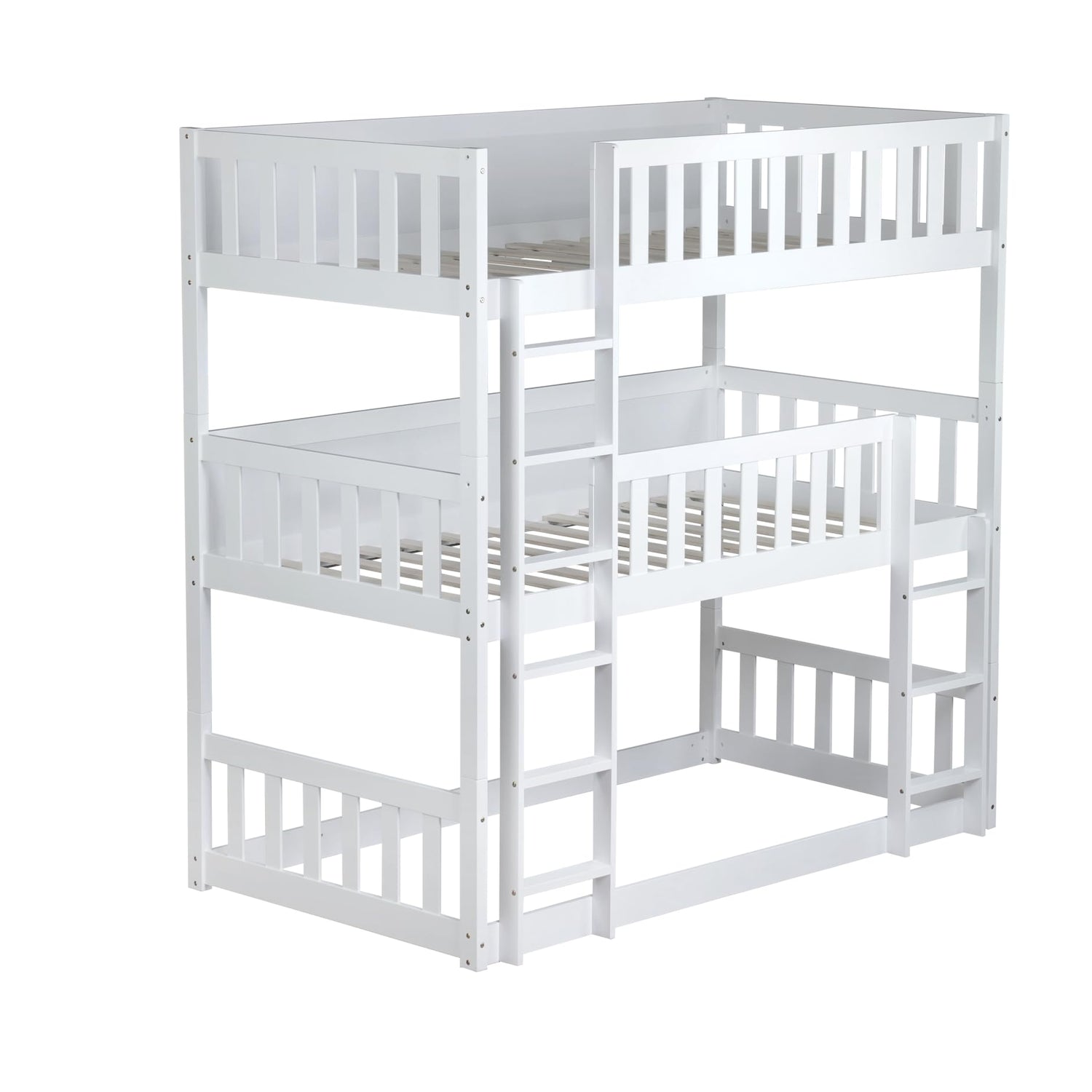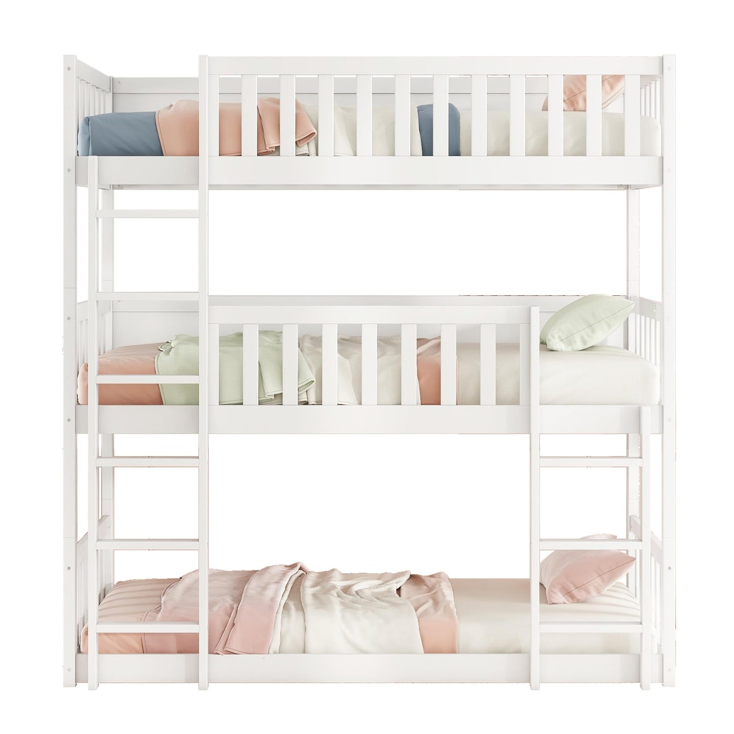 - đ„ăSafety Twin Size Bunk BedăThis twin size triple bunk bed for kids featuring low profile design, lower bunk is perfect for families with younger kids.The triple bunk bed features full-length guardrails on the upper and middle bunk to prevent accidental falls.Note: no slats on the bottom bunk.