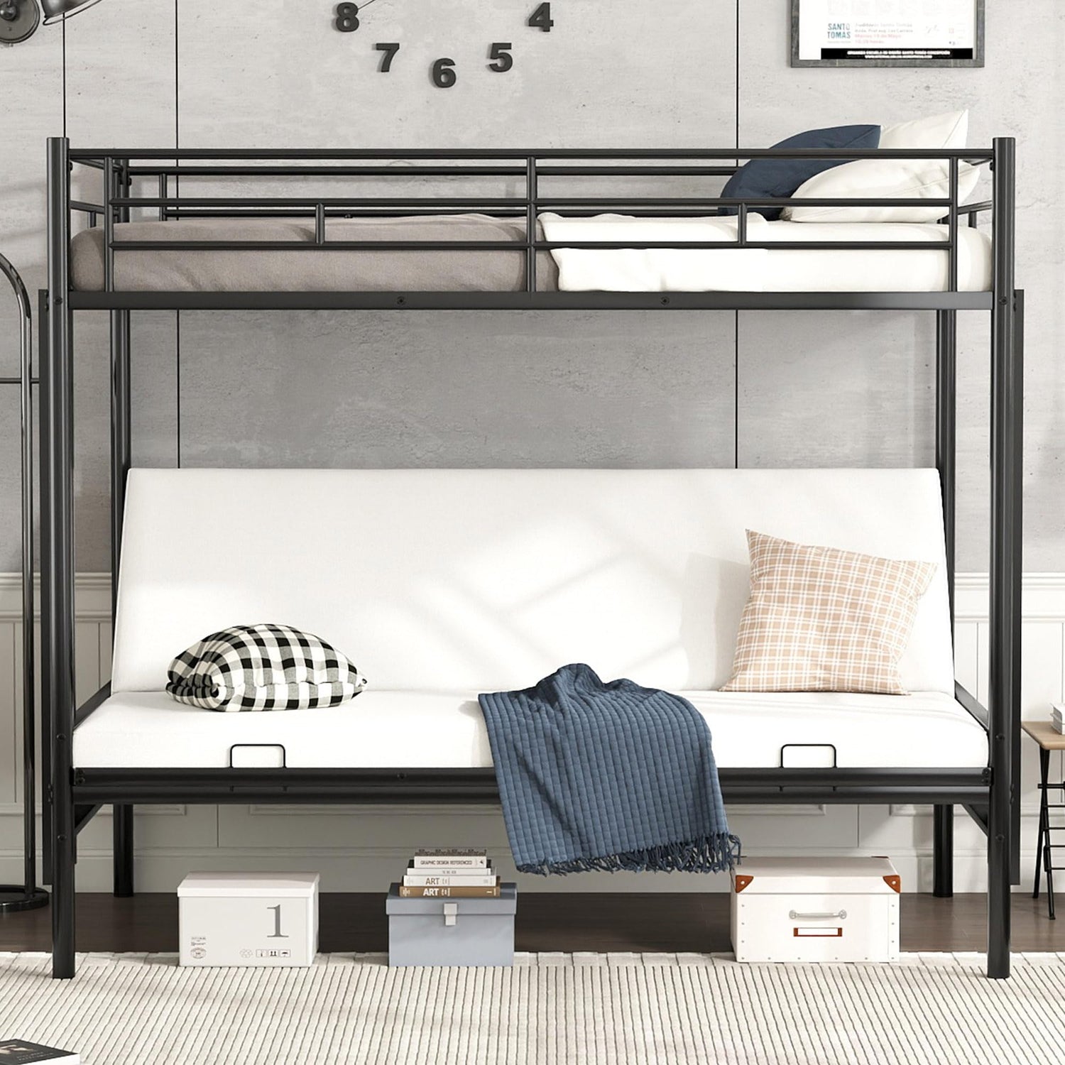 - [Futon bunk bed : Versatile Design] This multi-functional metal bunk bed features a convertible futon couch as the bottom bunk, perfect for kids' bedrooms, dorm rooms, teens' rooms, or guest rooms.