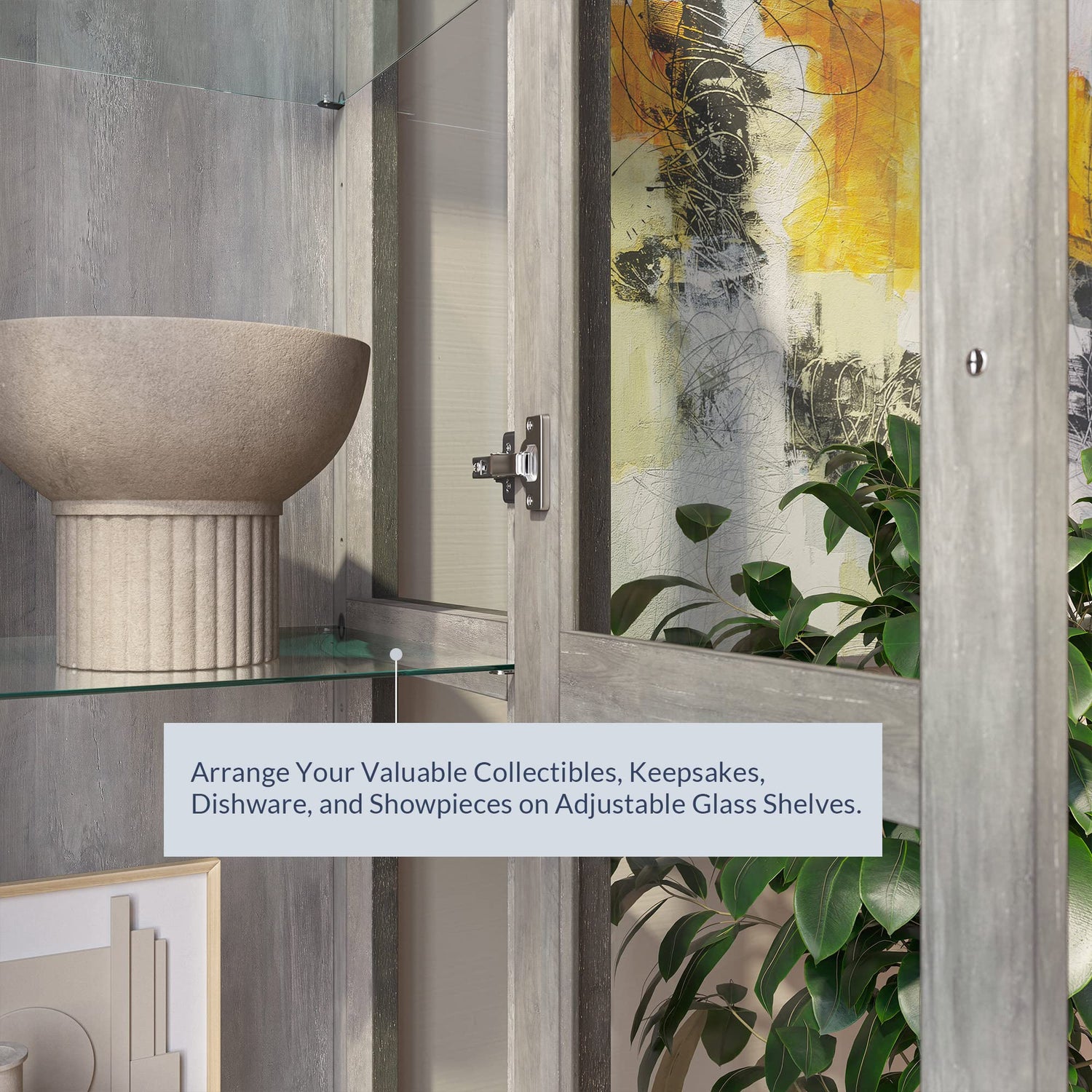BELLEZE 68" Height Curio Cabinet, Tall Glass Display Cabinet with Adjustable Shelves for Living Room, Trophy Display Case - Avalon (New Gray Wash)