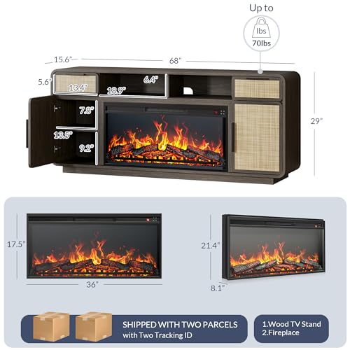 - [68" Fireplace TV Stand] - Elevate your entertainment setup with our 68" long fireplace TV stand, crafted to accommodate TVs up to 75". Paired with a 36" electronic fireplace, this entertainment center promises a cozy viewing experience.