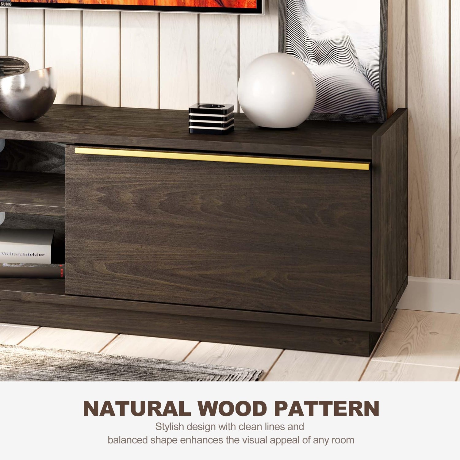 - [Attractive Entertainment Center] - This tv media cabinet stand has a contemporary aesthetic with a natural wood pattern and golden alloy handles. It's stylish design with clean lines and balanced shape enhances the visual appeal of any room. Bold and geometric, it features a nice sleek silhouette that will please any onlooker's eyes.