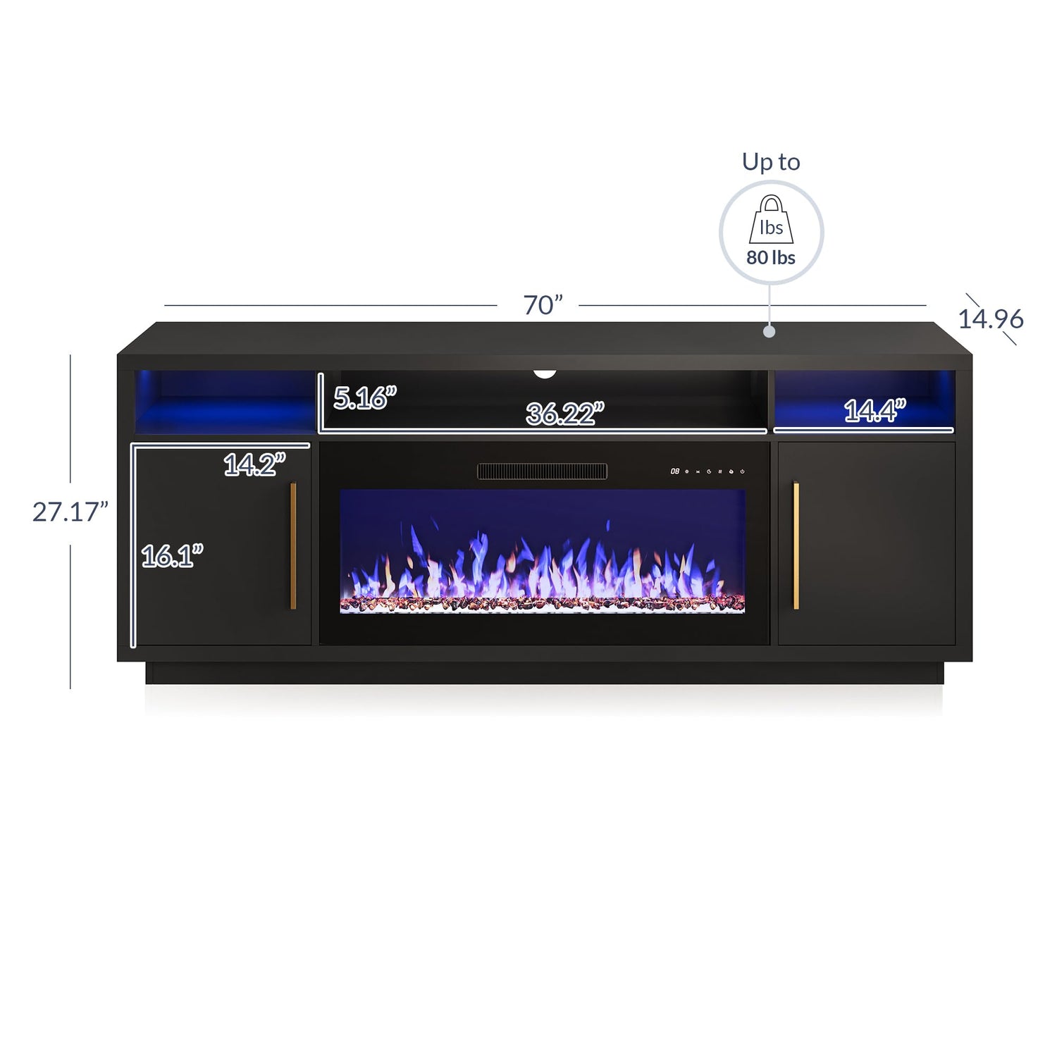- [Attractive Form & Function] Its sleek and modern appearance elegantly fits into any home's living room or entertainment center with multiple storage options. Place your favorite devices up to 80 lbs on this TV stand and objects up to 30 lbs inside the 3 open shelves or 2 large cabinets.