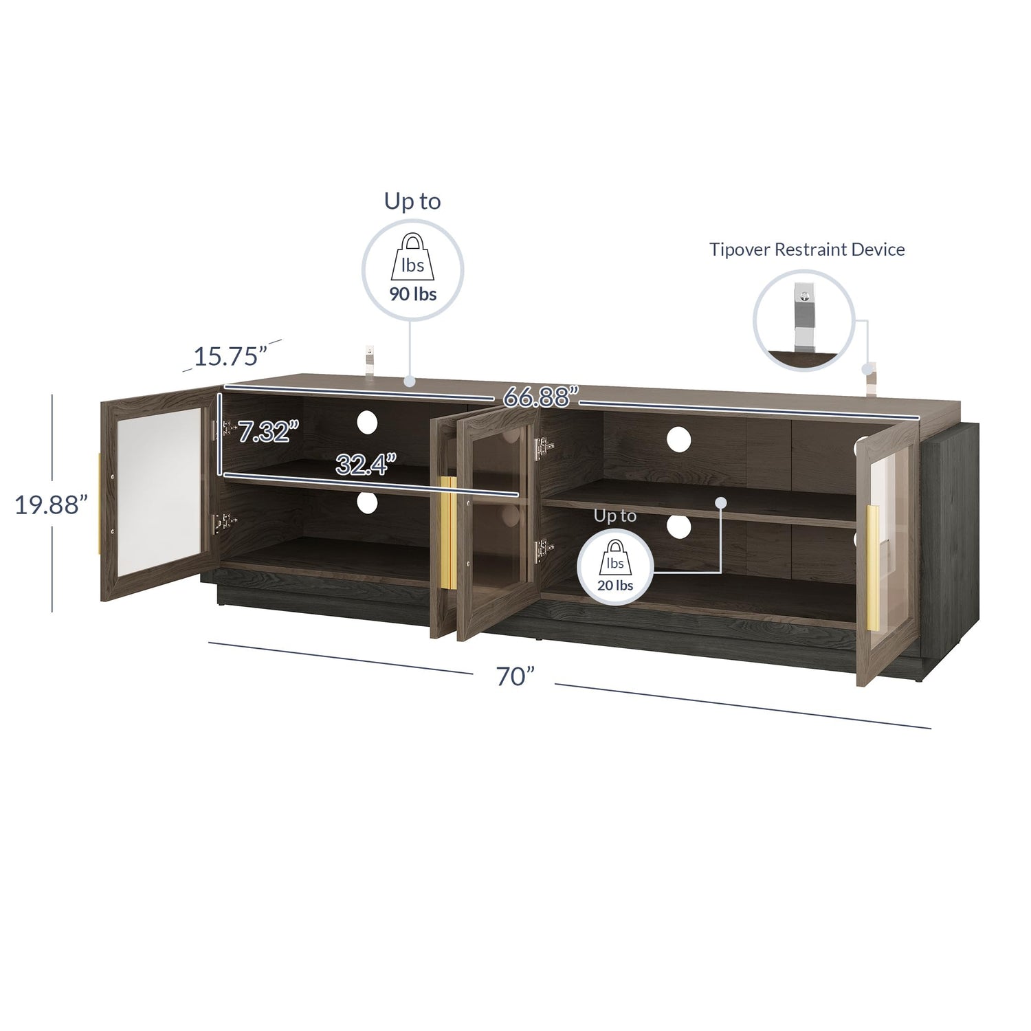 - [MODERN TV STAND] Stylish design with clean lines, mixed color accents, and golden alloy handles give this TV stand a contemporary appeal with a decorative touch. Measures 70"L x 15.75"W x 19.88"H with a capacity of 90 lbs and holds TVs up to 75".