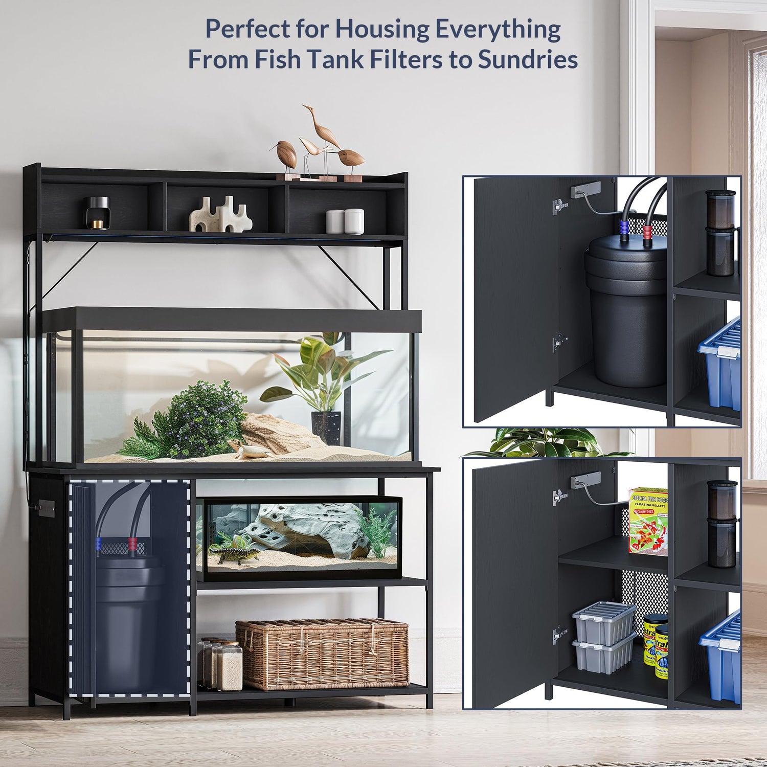 - [Multi-function Fish Tank Stand] - This fish tank accessories storage cabinet with a top shelf is suitable for 55-90 gallon fish tanks. It features RGB lights and a charging station, equipped with 4 AC outlets, 1 USB port, and 1 Type-C interface, making the storage cabinet convenient to use electrical appliances such as heaters and filtration systems. The storage cabinet includes an iron mesh back panel to prevent items from falling backward, enhancing safety.