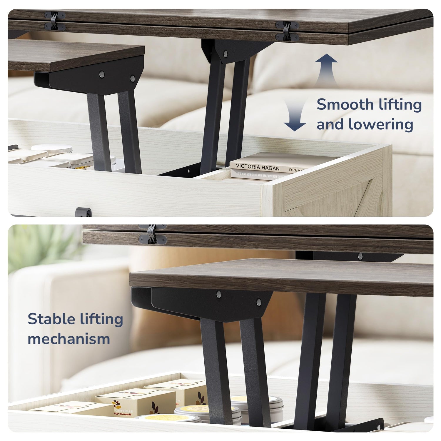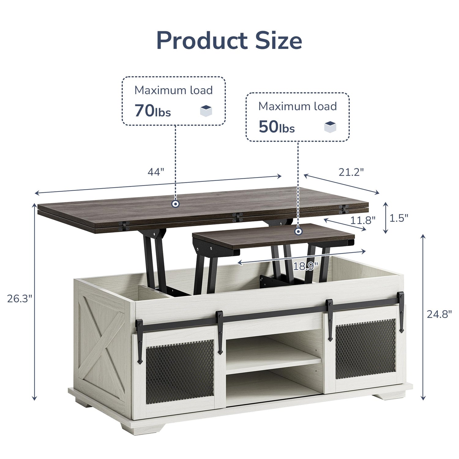 Details: Experience versatility and style with our multifunctional lift top coffee table. Its 3-in-1 design adapts to your needs: from a spacious dining or gaming table for 4-8 people, to a convenient workstation for two, and even ample storage space when the lift top is closed. Crafted with a sturdy double-top lift and metal arm, this coffee table offers stability and quiet lifting, supporting up to 120lbs with ease. The farmhouse style adds charm, blending industrial and modern aesthetics with metal barn doors and a retro color scheme. With three compartments under the lifting top and additional storage cabinets, this coffee table keeps your living room organized. Complete your living space with both practicality and elegance! Specification: Material: Manufactured Wood, Metal Overall Dimension As Regular Coffee Table: 21.2"D x 44"W x 18.8"H Overall Dimension As Dining Table: 42.4"D x 44"W x 25.6"H Regular Coffee Table Tabletop Weight Capacity: 120 lbs Each Shelf Weight Capacity: 20 lbs