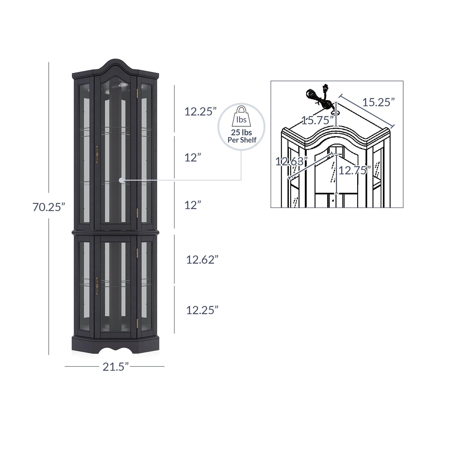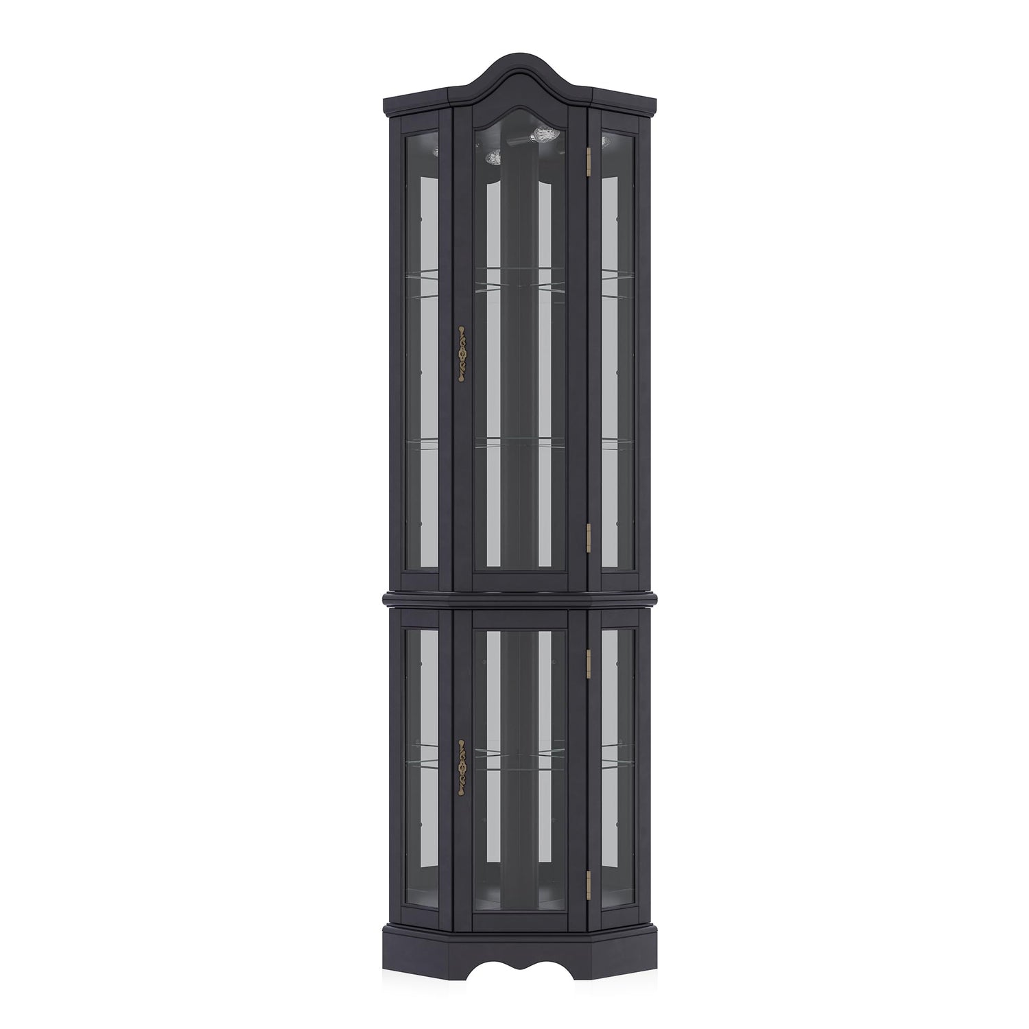 - [Plenty of Gorgeous Display Space] This storage cabinet has 2 glass pane doors, 3 glass panels, and a total of 5 triangular corner shelves divided into two sections. Shelves are adjustable to your liking. An included light lets you add extra flair and beaming light to whatever you choose to display inside. Mirrored back panels help create a grand showcase.