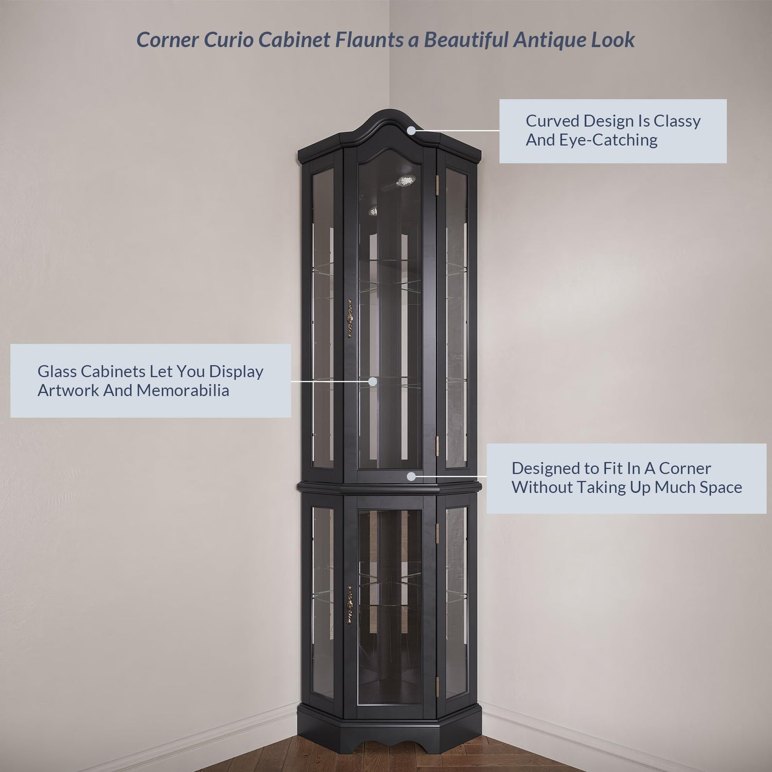 - [Perfect Size] Constructed from high-quality solid wood, this top design corner curio cabinet has a slim and space-saving shape that tucks securely into a corner of your home. It will allow you to organize your favorite collectibles and treasures while leaving plenty of room for other furniture to adorn your room.