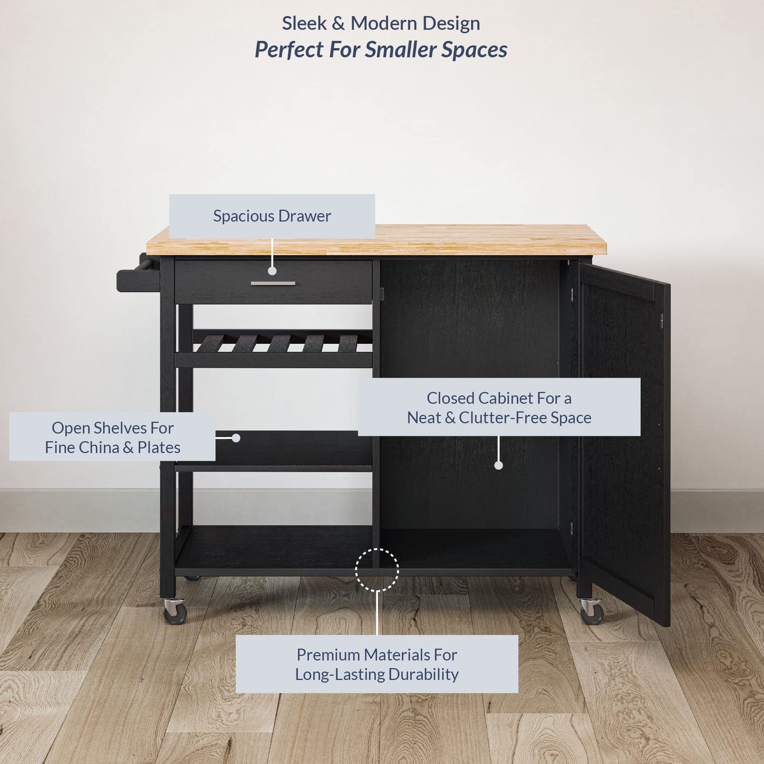 BELLEZE Modern Rolling Kitchen Island Utility Cart with a Drawer, Storage Cabinet, Handle Towel Rack, Rubber Wood Top, and Caster Wheels - Sonoma (Black)