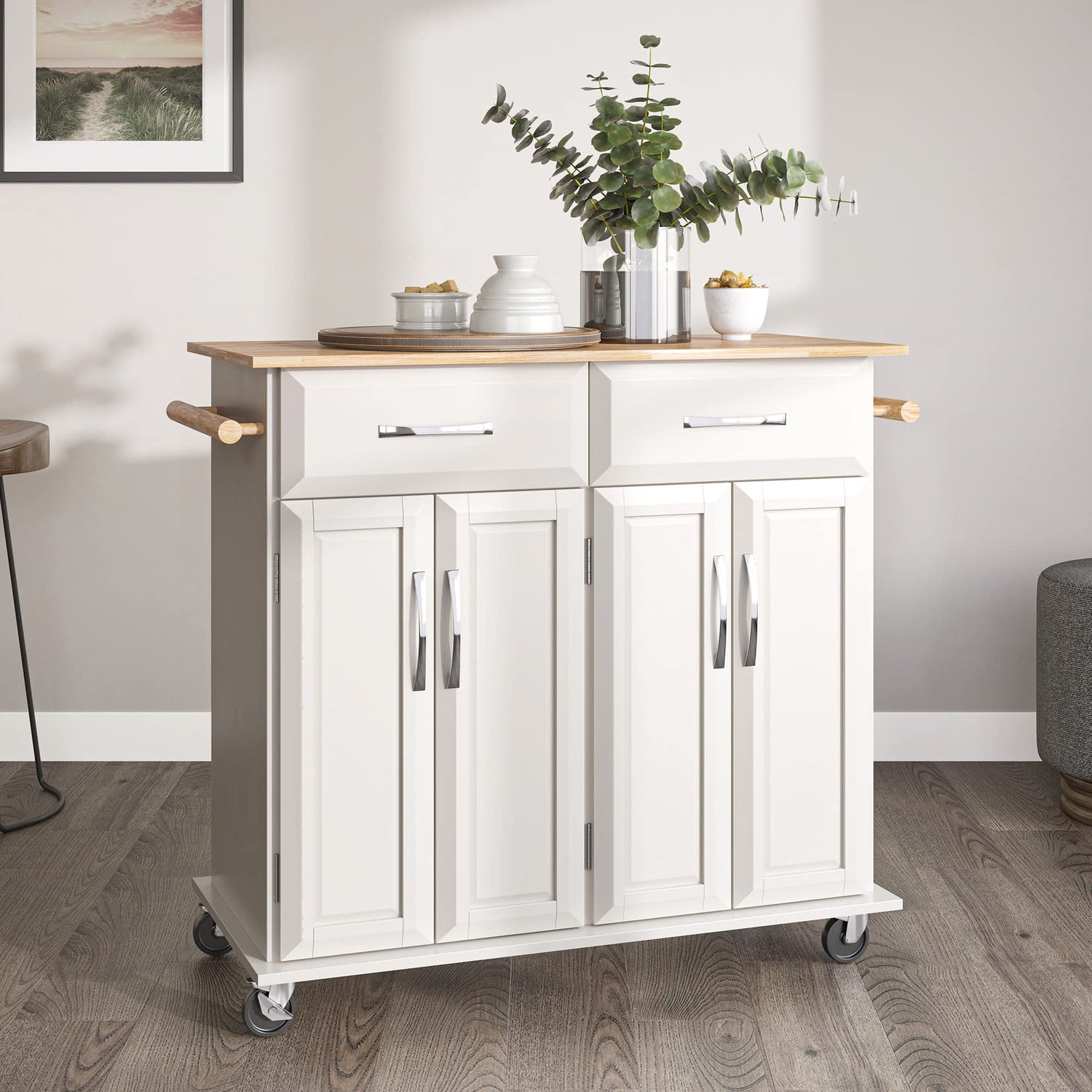 - [LOCKABLE & ROLLING KITCHEN ISLAND WITH STORAGE] Four 360 degree wheels provide easy portability. 2 Lockable wheels enable this kitchen island cart to be secured in place for greater convenience while serving or prepping food.