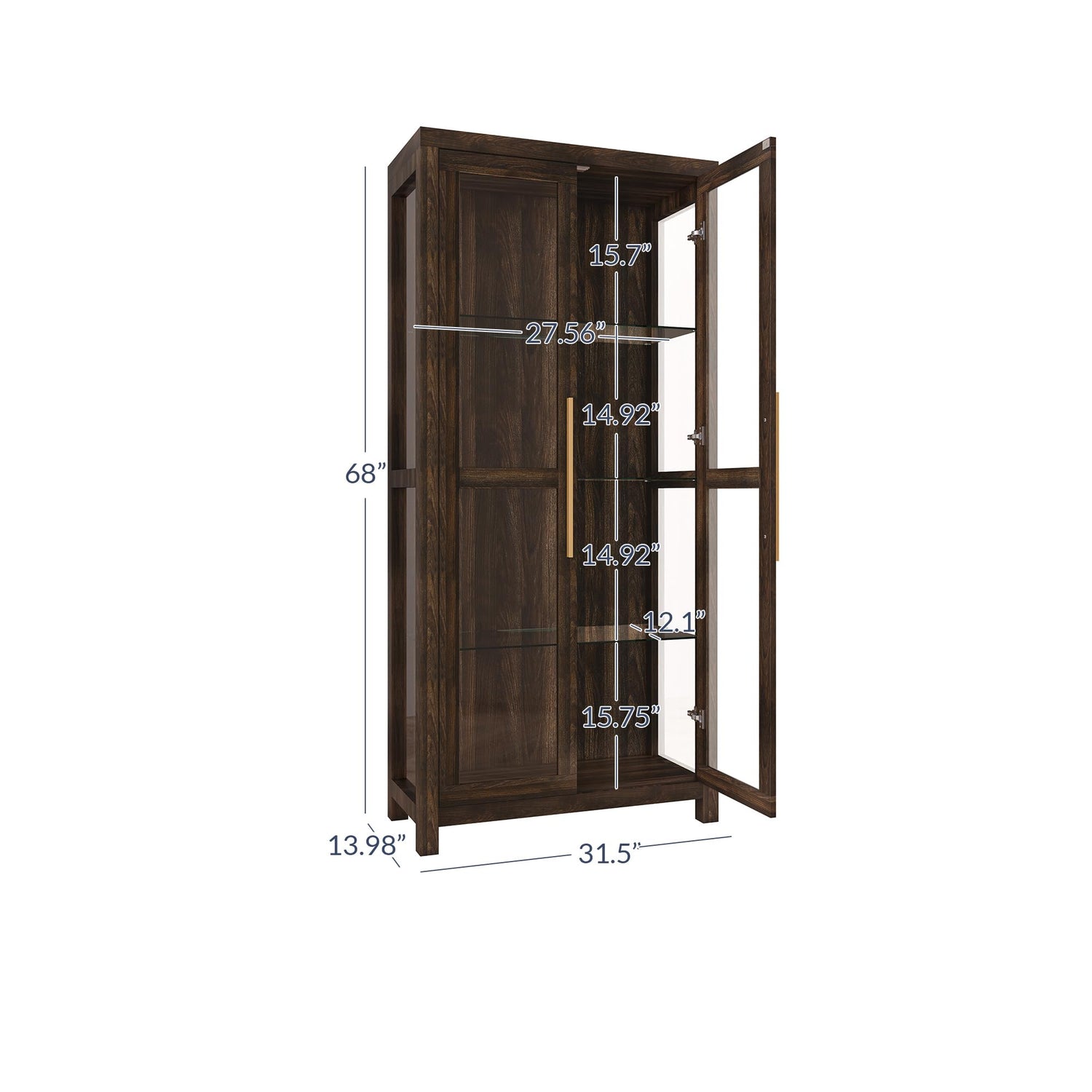 Details: Modern and classic styling merge with the Avalon Curio Cabinet perfect for your home's maximum viewing pleasure. A high-quality cabinet poised for your living room, office, game room, or bedroom ready to organize and display your books, collectibles, media, CD/DVDs, games, and more. This pleasing curio cabinet features three adjustable glass shelves for easy and convenient organization make this a home essential. Stylish design and clean lines meets rustic minimalism with either dark walnut or a gray wash finish. Its ideal presence is a result of a nice and tall 68" height reinforced with anti-tipping straps for increased safety. Enjoy the maximum space of your home with this glass display cabinet that will make any room instantly feel organized and aesthetically pleasing. Customize the glass tempered shelves for your needs and display whatever you desire. Our Avalon Curio Cabinet is an excellent choice that belongs in your home now. Specifications: Material: manufactured wood, tempered glass Overall dimensions: 31.5"L x 13.98"W x 68"H Shelves dimensions: 1st shelf: 27.56"L x 12.1"W x 15.7"H 2nd shelf: 27.56"L x 12.1"W x 14.92"H 3rd shelf: 27.56"L x 12.1"W x 14.92"H 4th shelf: 27.56"L x 12.1"W x 15.75"H Leg height: 2.56" Total weight capacity: 80 lbs Each shelf weight capacity: 20 lbs Magnetic cabinet doors: yes
