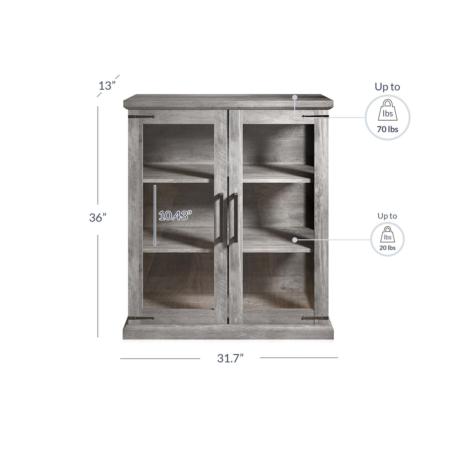 Details: This classy cabinet gives your decor an elegant spin of style, no matter where you place it in your home. It looks fabulous as a sideboard in your kitchen or dining space, allowing you to store and showcase your treasured fine china or the precious heirloom pieces handed down by your mom or grandmom. In the entryway or living room, it doubles up as an accent cabinet and an organizer, bringing style and functionality to your spaces. The beauty of this cabinet lies in its details - traditional crown molding, decorative black metallic hardware, and the warm wood finish. The middle and bottom shelves are adjustable, helping you to accommodate tall items with ease. Tempered glass doors are break and shatter-resistant for greater safety. This cabinet features high-quality manufactured wood construction, so it's durable and long-lasting. Anti-tipping brackets keep the unit stable and well-balanced. Below are the specifications of this cabinet: Style: Traditional Easy to clean Material: Manufactured wood Overall dimensions: 31.7"L x 13"W x 36"H Weight capacity: 70 lbs Meets ANSI/SOHO quality standards for safety Black metallic decoration and handles Tempered glass doors Anti-tipping straps Adjustable shelves