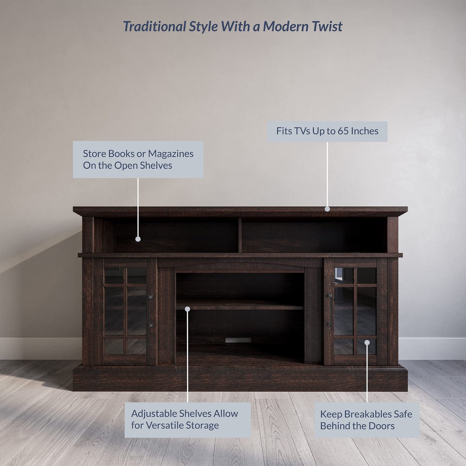 - [CLASSIC DESIGN] An elegant TV stand with a timeless design that blends rustic design with a modern look. The warm espresso finish lends a beautiful touch.
