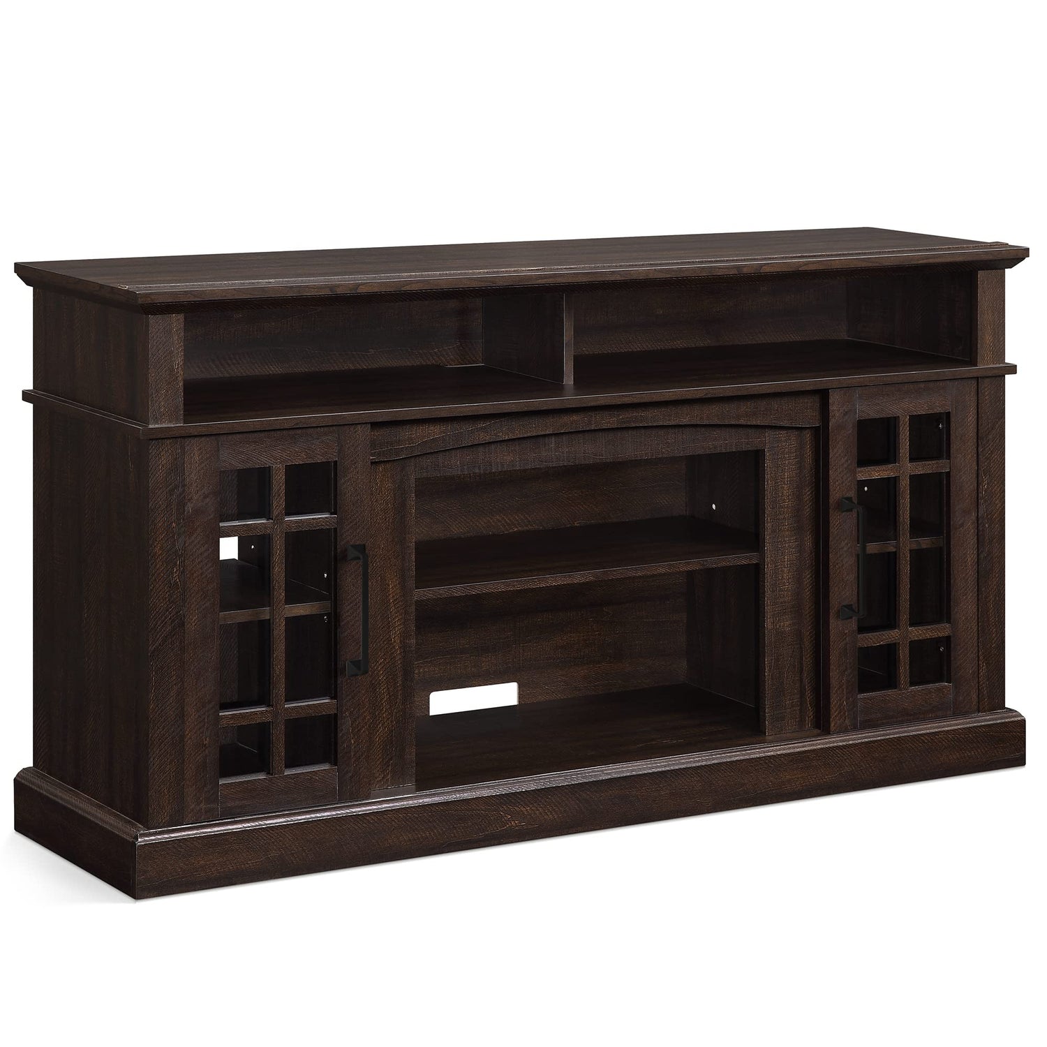 - [FINE DETAILING] This entertainment console has contoured edges and finely crafted moldings for an added appeal. Glass window panes and wooden detailing on cabinet doors create a stylish look.