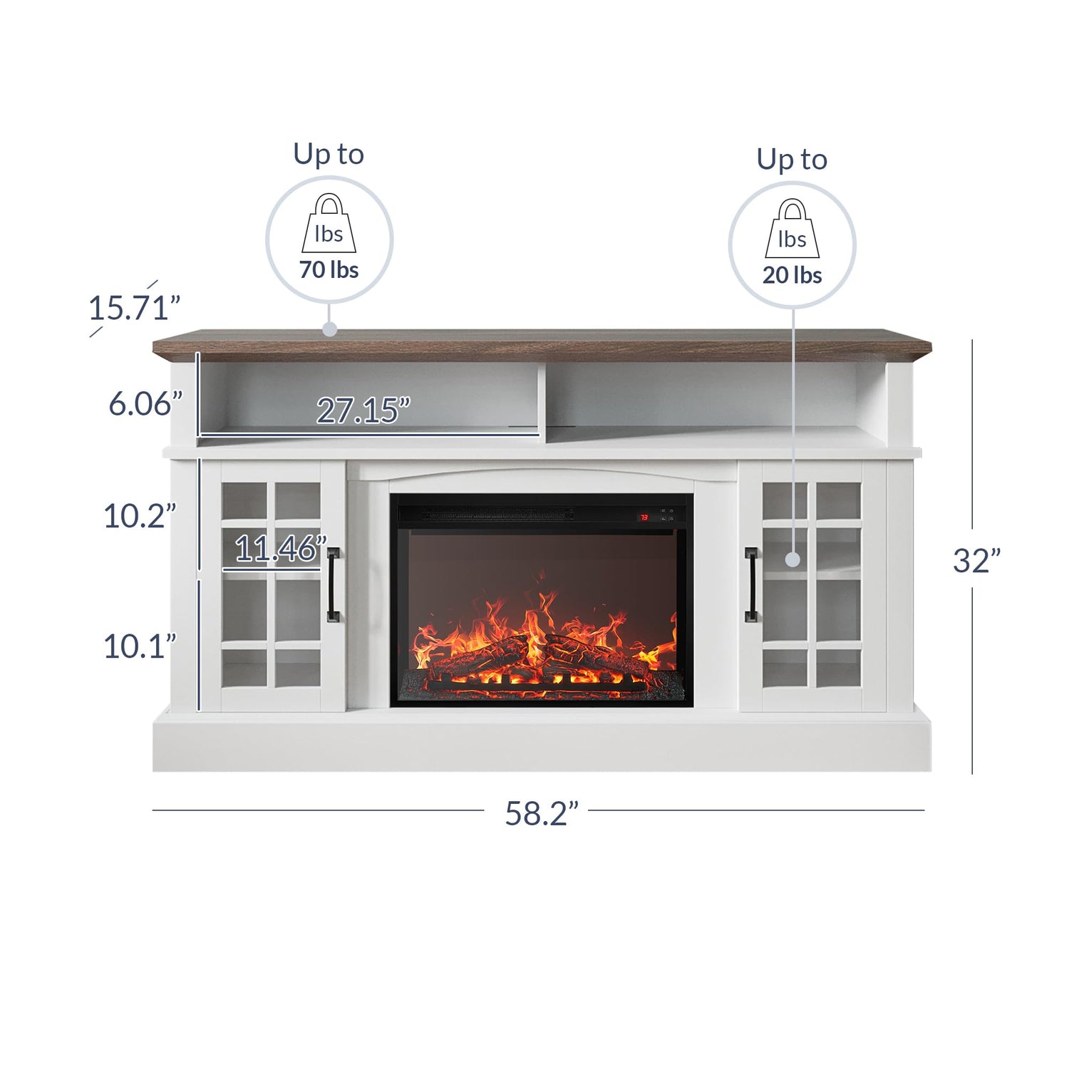 BELLEZE Traditional 58" Rustic TV Stand with 23" Electric Fireplace Heater with Sound, Media Entertainment Center Console Table for TV up to 65" with Open Storage Shelves and Cabinets - White
