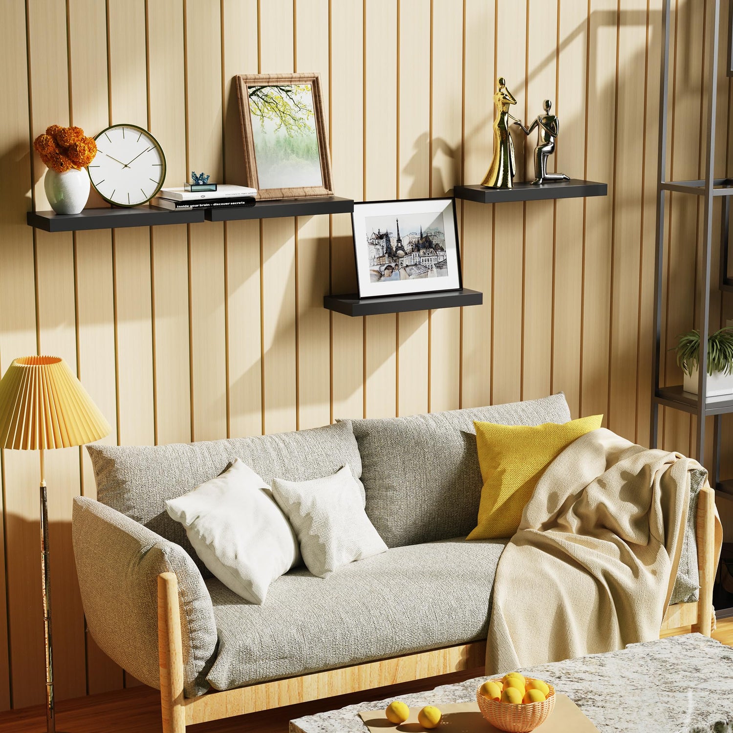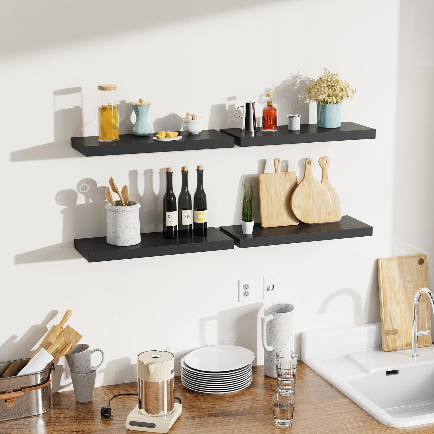 - 【Versatile & Functional】Our black floating shelves for wall can simplify our life which let everything will be in reach. Our wall shelf is a perfect space to display our family pictures, books, memorandums, charming antiques or artwork, spices or jars and fresh green plant. Our floating shelf wood not only give us extra storage but also improve the beauty of our home decor. Our black shelves can be perfectly integrated and decorated in the bathroom, kitchen, living room, bedroom and other place.