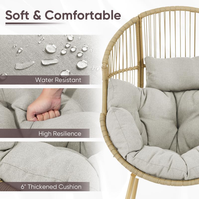 - Premium Comfort Cushion: This outdoor single Lounge rattan egg chair includes 6 inch thick cushions made from water-resistant olefin fabric, providing luxurious comfort. Each single patio lounge wicker egg chair cushion is equipped with ties to secure them firmly in place, ensuring they don't shift during use.