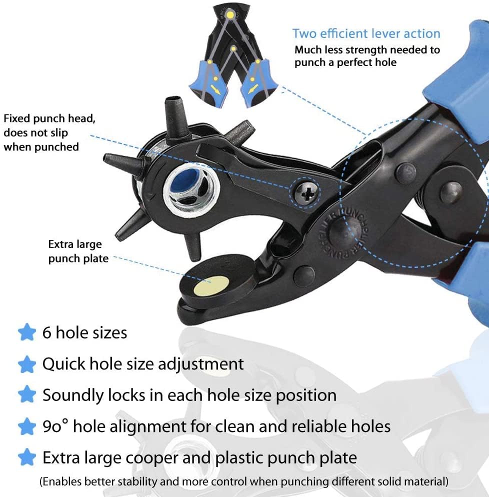 - 【Multifunction】The belt hole puncher has 6 different sized holes:2mm,2.5mm,3mm,3.5mm, 4mm and 4.5mm, all the most popular sizes. and is commonly used for punching round holes in leather, plastic, canvas, fabric, saddles, and similar materials; especially useful as a leather hole punch.