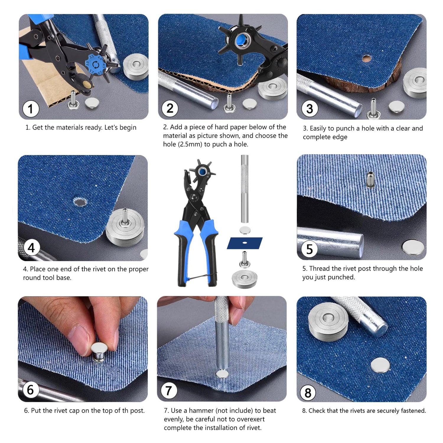 Belt Hole Puncher with 240 Sets of Leather Rivets - Updated Hole Sizes Puncher for Belt, Watch Band, Strap, Dog Collar, Saddle, Shoes, Fabric, DIY Home or Craft Project