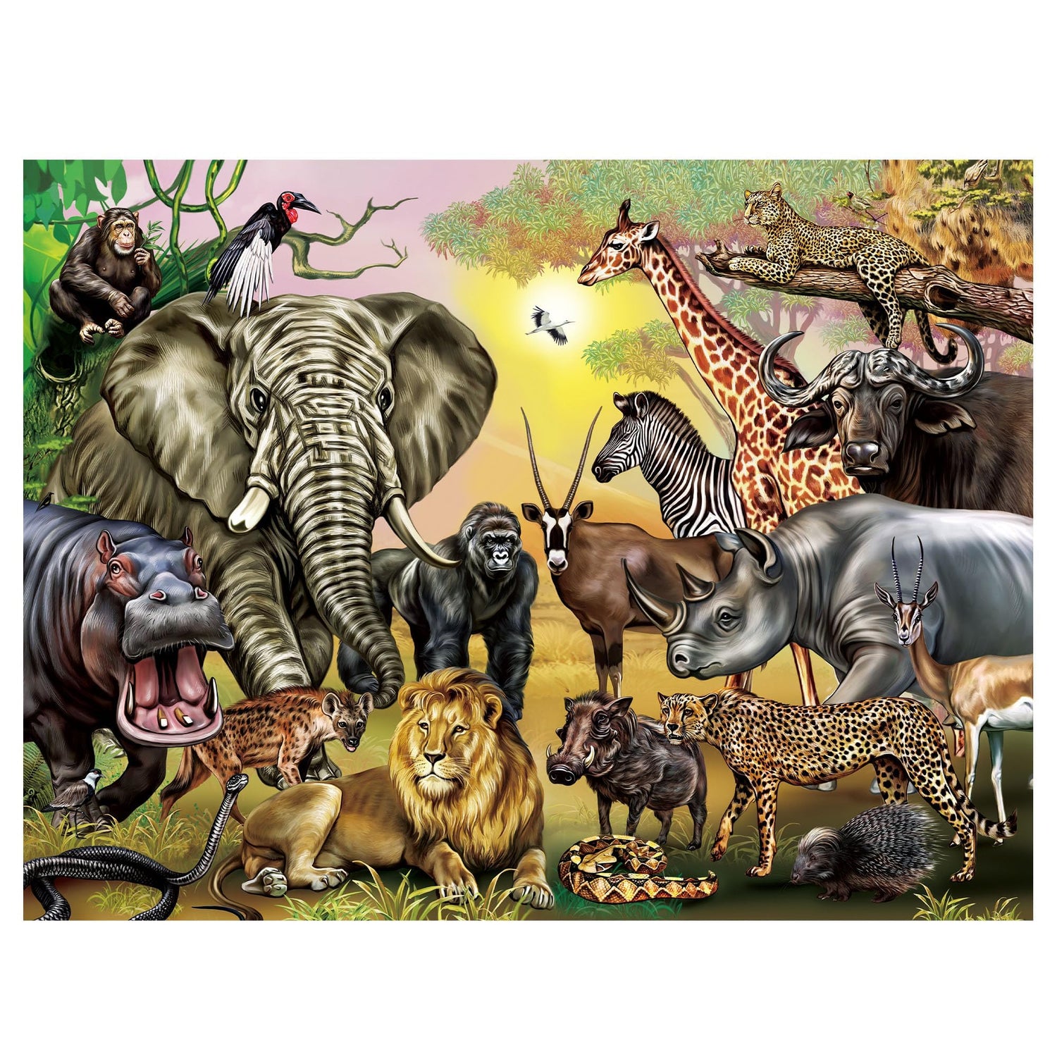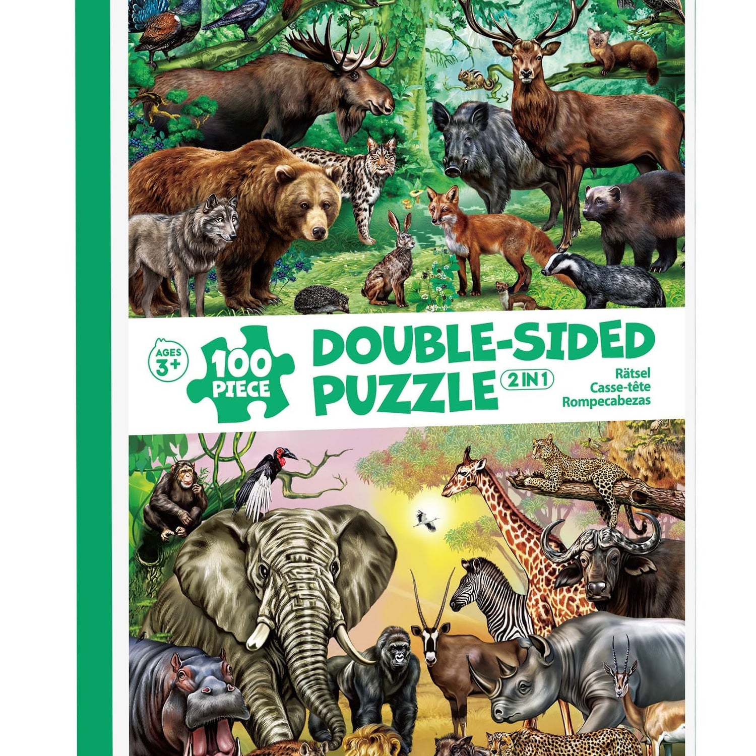 - 【TWO PUZZLES IN ONE】 This 100-piece double-sided puzzle features forest animals on a matte finish side and safari animals on a smooth gloss finish side; the differing images and surface textures help distinguish the puzzle sides; The finished puzzle measures 15.75” x 11.75”