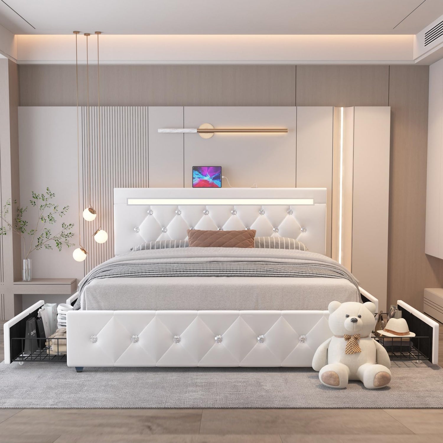 Benevika Full Size Bed Frame with 4 Drawers and LED Light, Charge Station, PU Leather Upholstered Platform Storage Bed with Adjustable Headboard, Wooden Slats Support, No Box Spring Needed, White