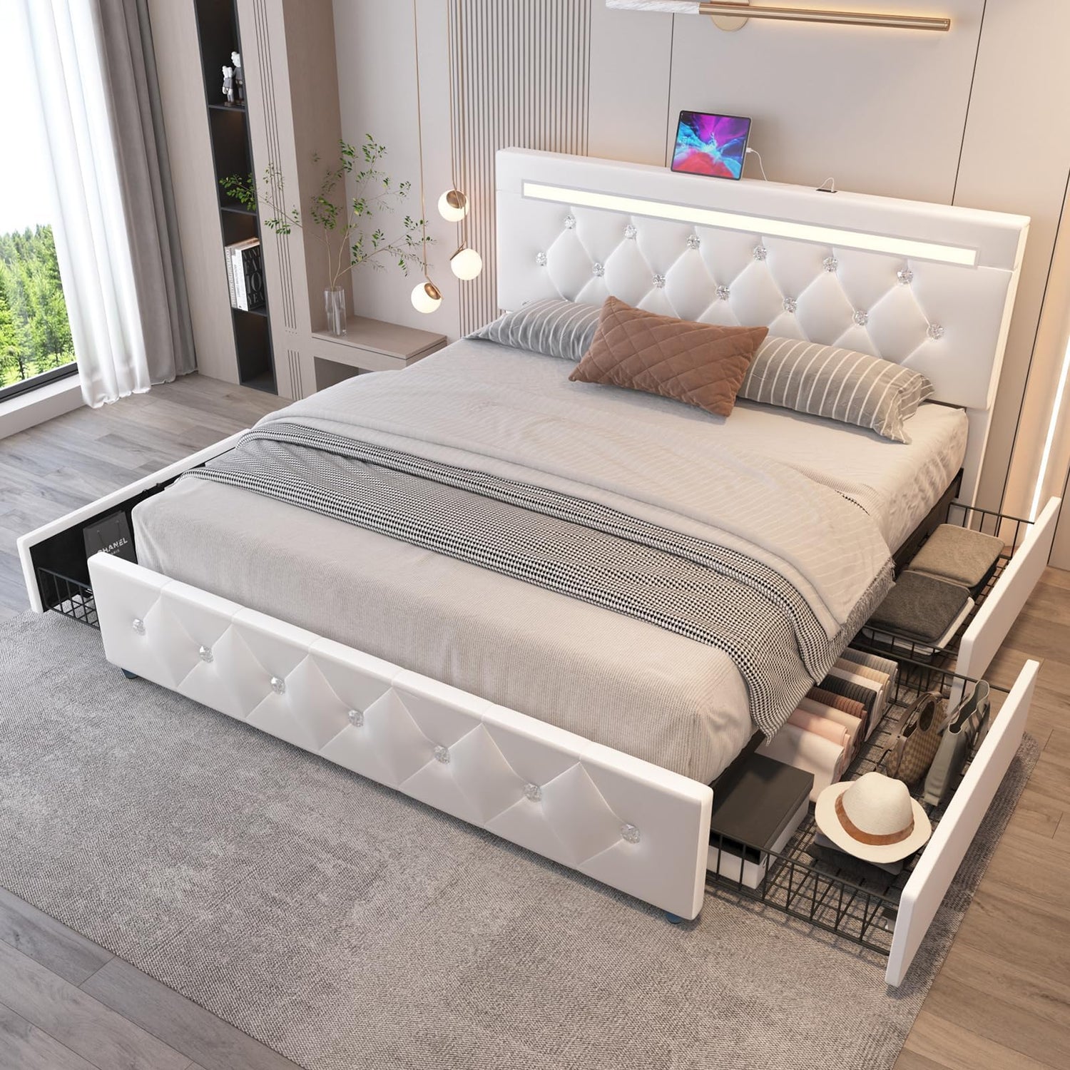 - Charge Station: Elevate your bedroom decor with button tufted headboard and UL Certified built-in USB and charge station. Each USB port delivers a speedy 5V/2A MAX output.