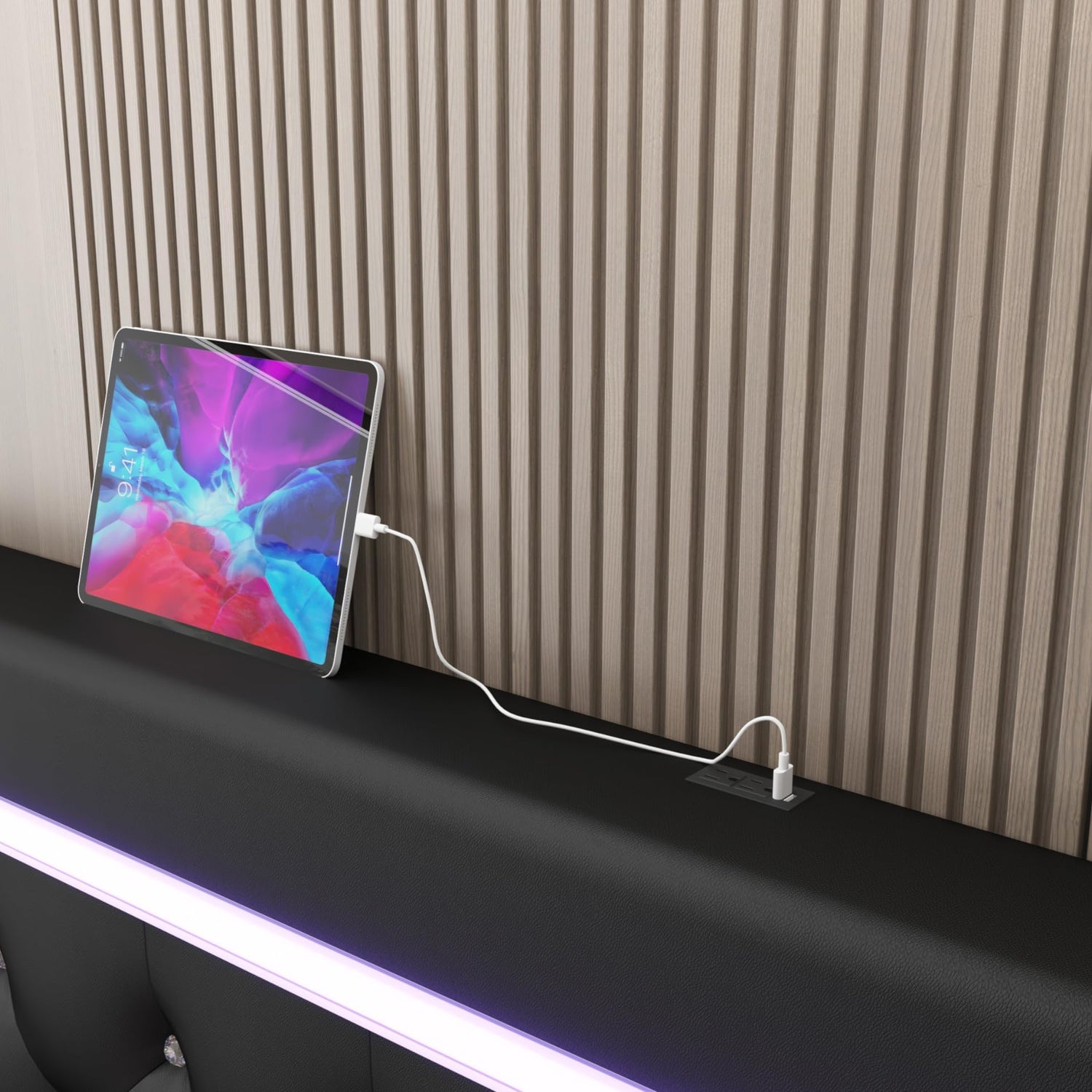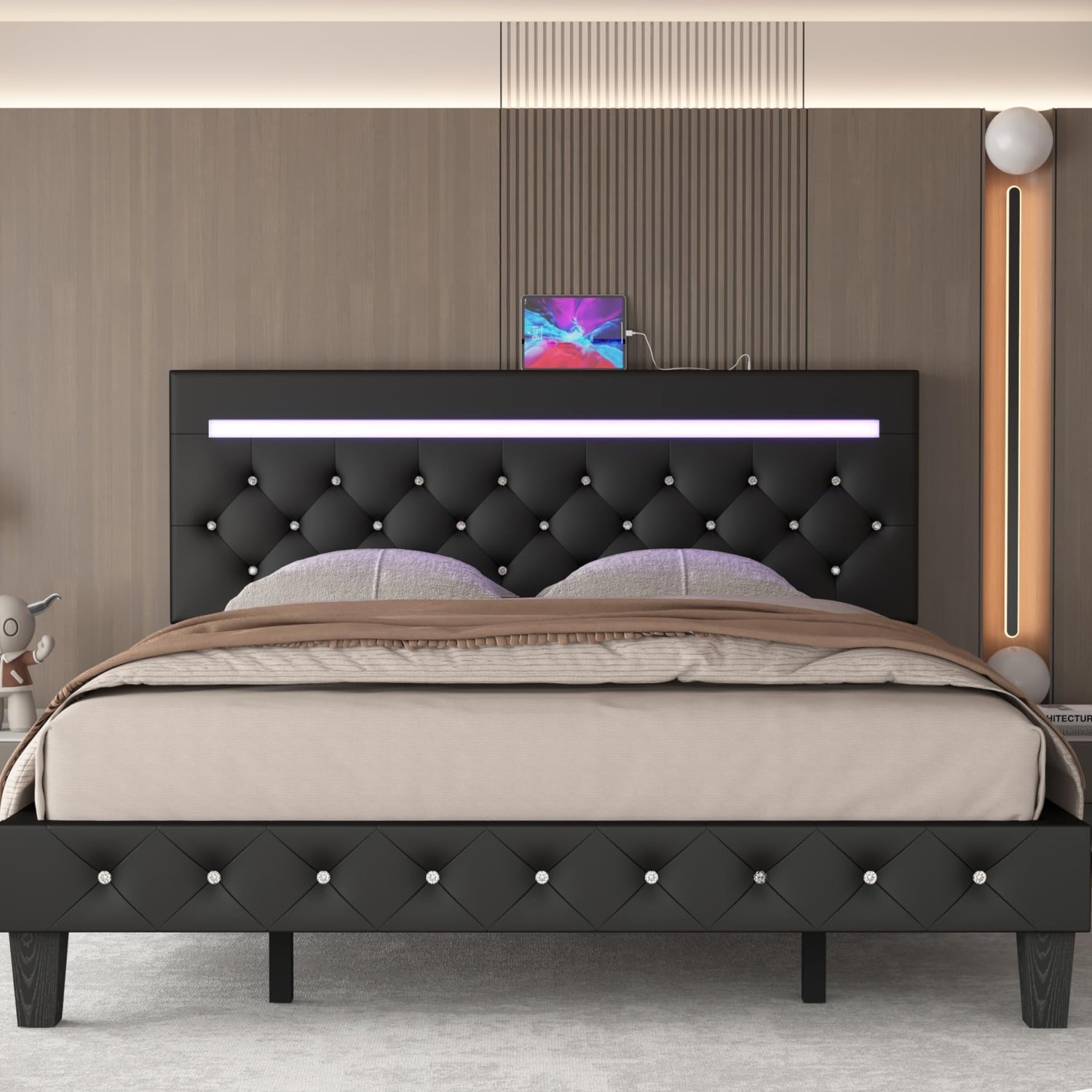 Benevika LED Upholstered Queen Size Bed Frame with Adjustable Headboard and USB Charging Station