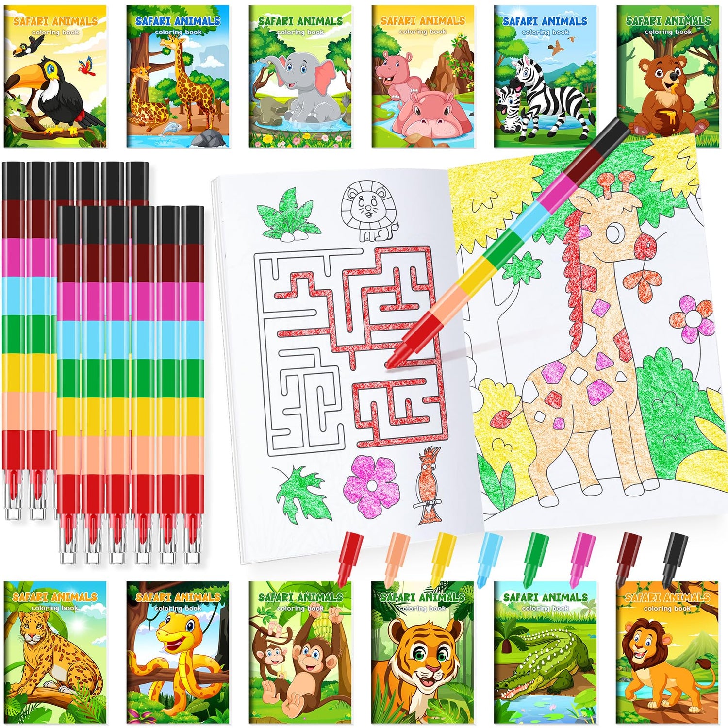 - Package Include: you will get 24 pieces of jungle safari coloring books bulk in 12 styles and 24 pieces of stacking crayons. The quantity is enough to meet your DIY needs, kids will be very excited to see safari animals mini coloring books