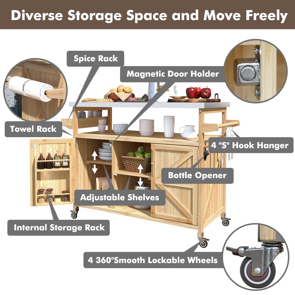 Bennbari Outdoor Kitchen Island, Rolling Kitchen Island with Storage, Farmhouse Solid Wood Kitchen Cart on Wheels, Outdoor Grill Table with Stainless Steel Top, 50 Inch Width (Natural)