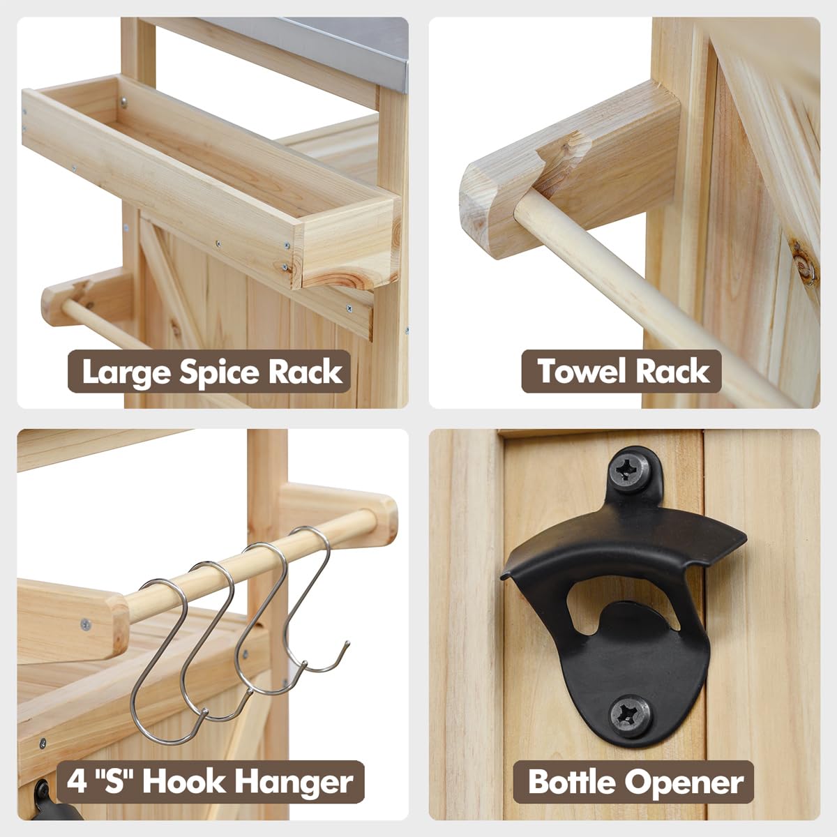 - [Heavy Duty Structure] Crafted from 100% exquisite fir wood, this outdoor bar cart exudes natural charm while prioritizing skin-friendliness and minimal chemical coatings. The 1.2-inch thick 201 stainless steel tabletop offers an easy-to-clean and durable spacious grill table for preparing food ready for cooking. Exclusively designed in your house, we guarantee a long-lasting and sturdy product.