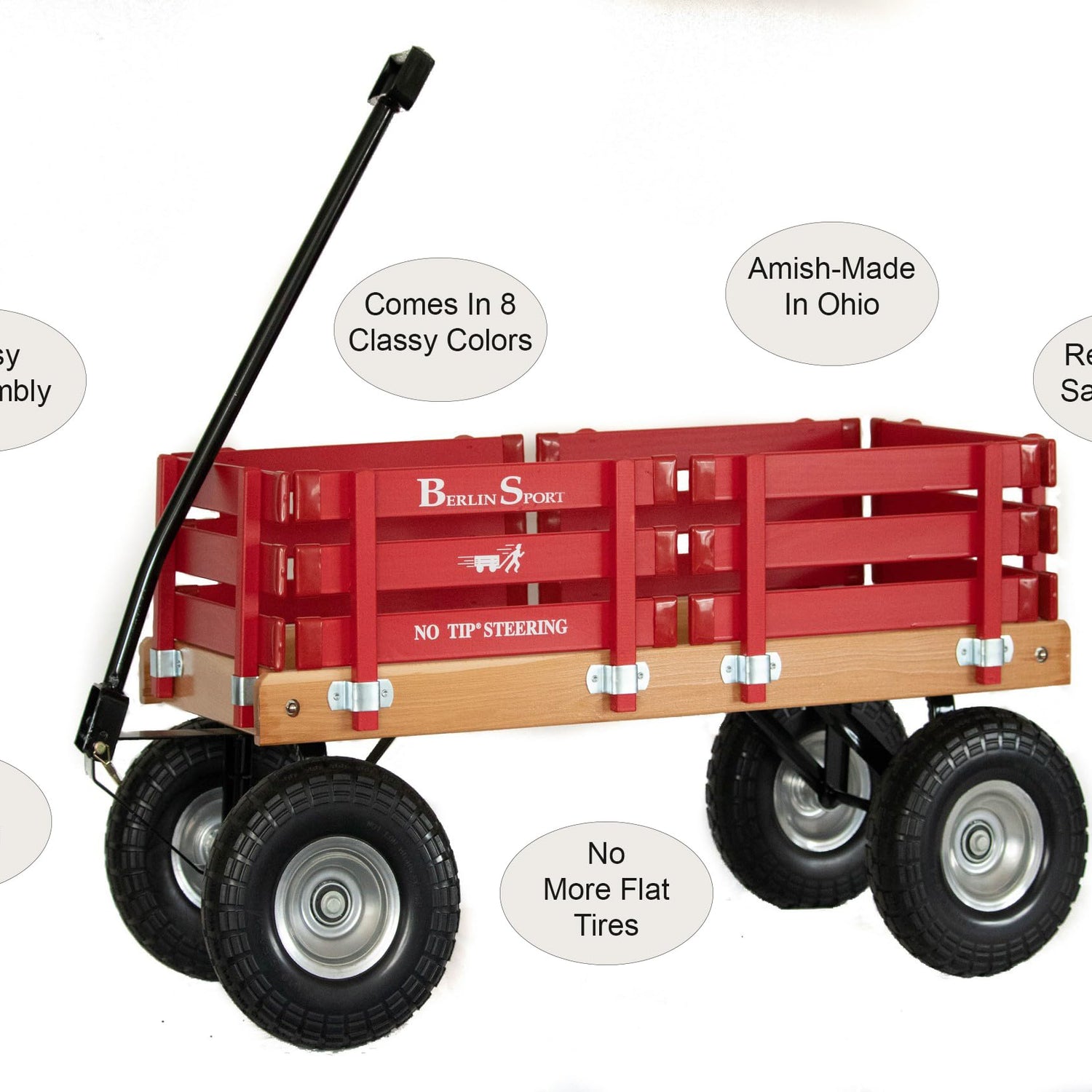 Details: Our Best-Selling Wagon by far! Berlin Flyer Wagons is an Amish and Mennonite owned and operated business in Holmes County, Ohio. The Berlin Flyer F410 Sport is the workhorse of the Berlin Flyers Wagon line, first made in 1965. These popular express wagons are made right here in Ohio using locally-sourced solid hardwoods and steel, and all parts (except the wheels) are manufactured in-house. Each Berlin Flyer Wagon is made with a solid wood bed, painted hardwood side rails that are easily removed, and an all-steel frame that is welded and powder-coated. Finally, the express wagon is finished with non-toxic paint and varnish for your peace of mind. The Berlin F410 Sport comes with 10" x 4" foam-filled tires and the wagon bed measures 36" x 17.25". Easy assembly (approximately 10-15 minutes) is required and detailed assembly instructions are included. The Berlin Sport Wagon weight capacity is rated for up to 300 Lbs. Choose between 8 flashy colors: Red, Emerald Green, Orange, Purple, Gray, Hunter Green, Pink, and Blue.