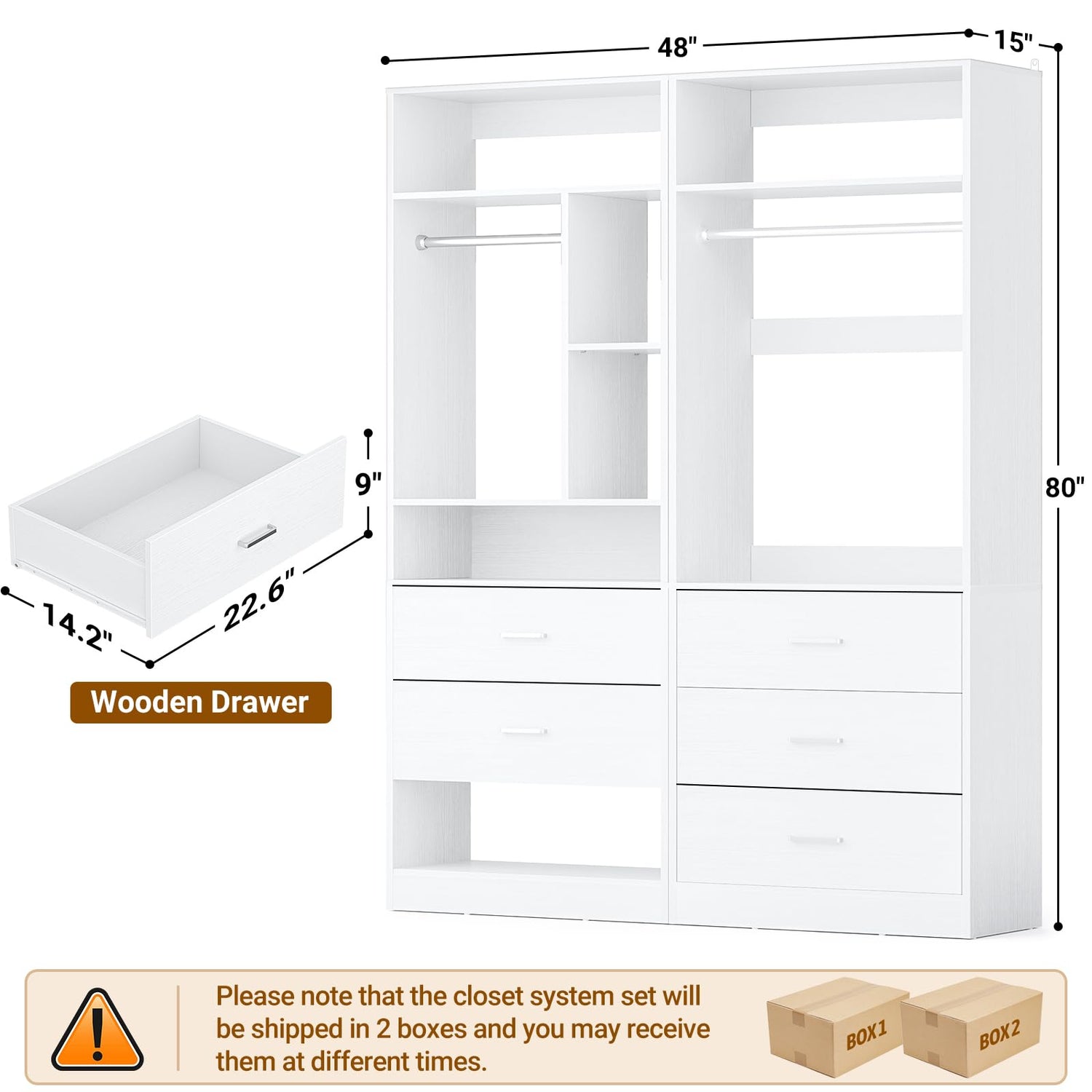 - Closet Organizer System Set of 2 - Closet systems have a total of 5 large wooden drawers + 2 top storage areas + 2 hanging areas. The perfect combination of drawers and shelves makes it easy to organize your stylish closet. Hold up to 300+ pieces of clothing or small items. Measures 48” Lx15” Wx80” H. Not only can be divided into 2 separate 24" closets, but the size is flexible enough to be purchased according to your space.