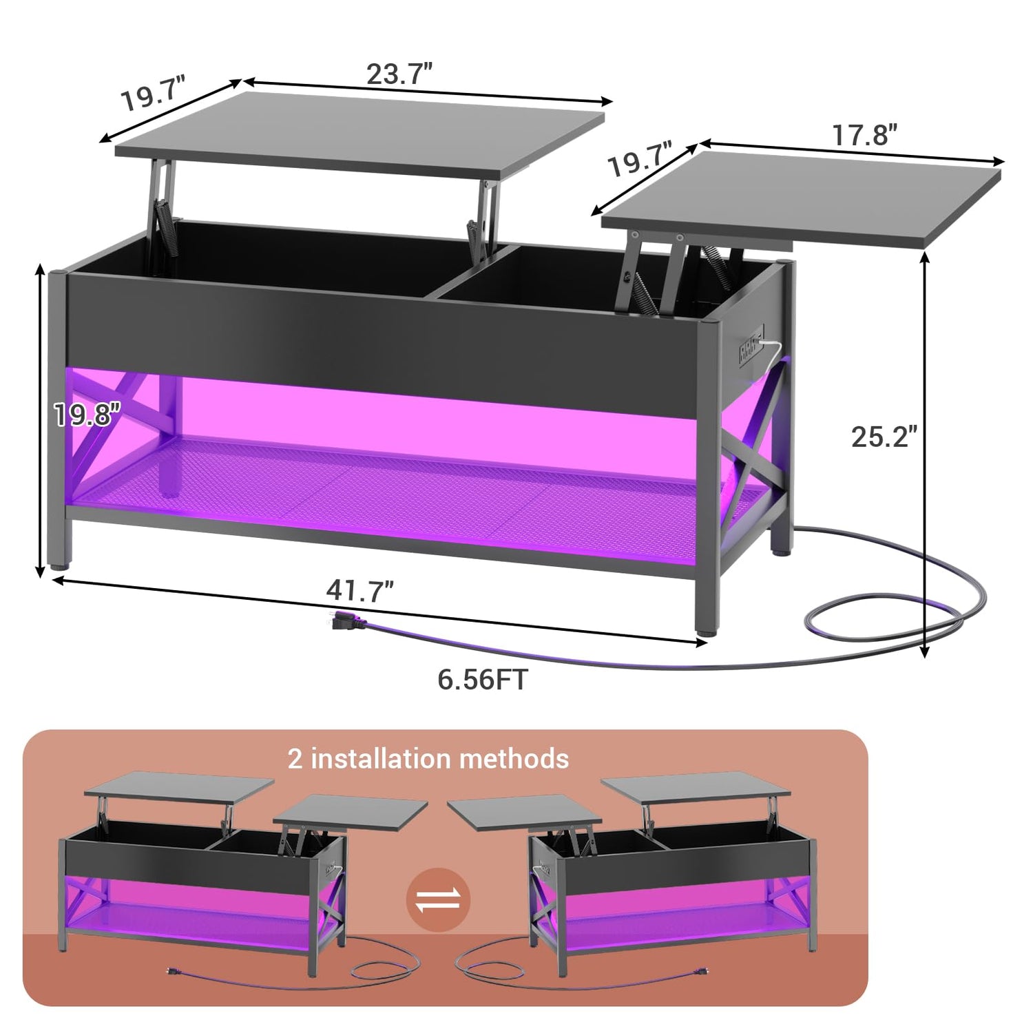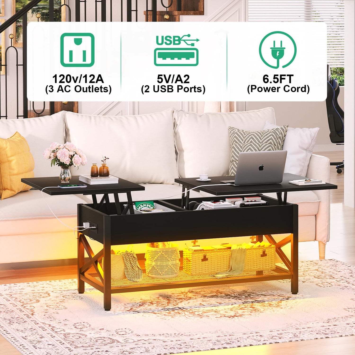 Besiost Coffee Table, Lift Top Coffee Table with Storage, LED Light & Power Outlet and Hidden Compartment, Retro Center Table for Living Room, X Support Wood Tabletop, Metal Frame,Black